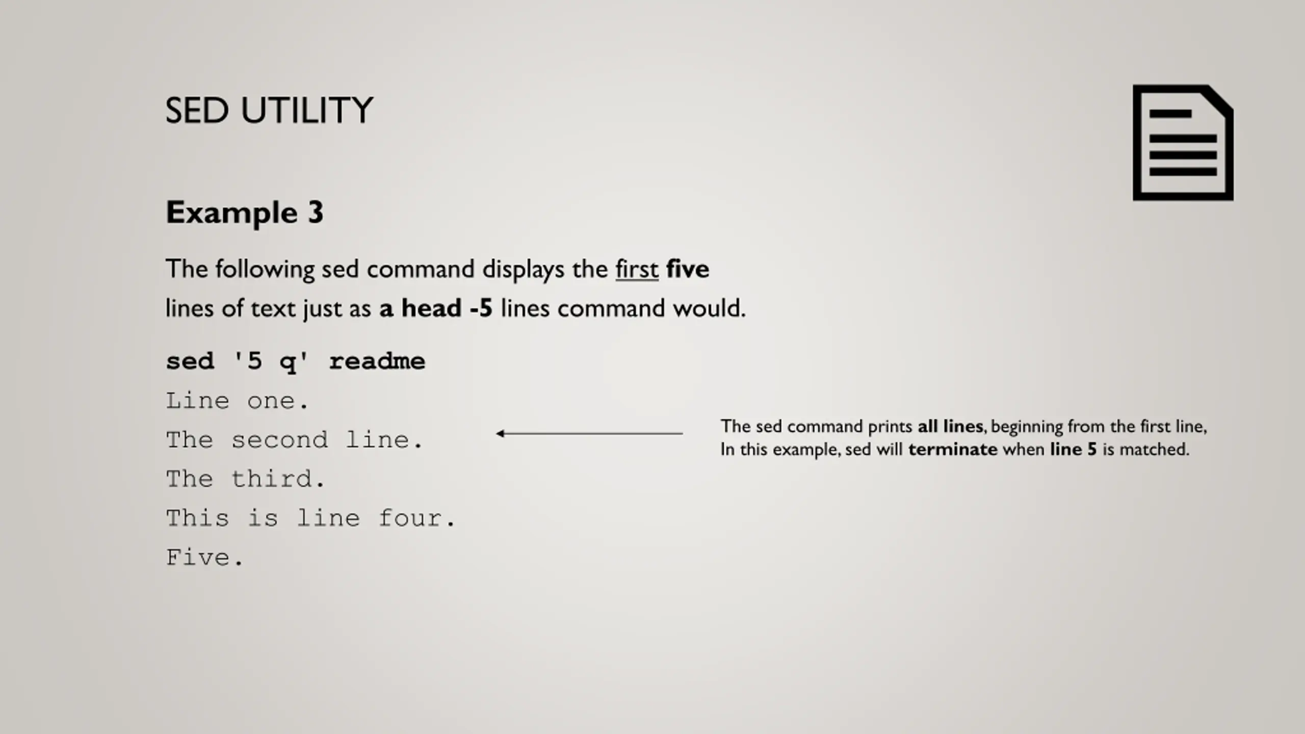 SED UTILITY Example 3 The following sed command displays the first five lines of text just as a head -5 lines command would. sed '5 q' readme Line one. The second line. The third. This is line four. Five. The sed command prints all lines, beginning from the first line, In this example, sed will terminate when line 5 is matched.