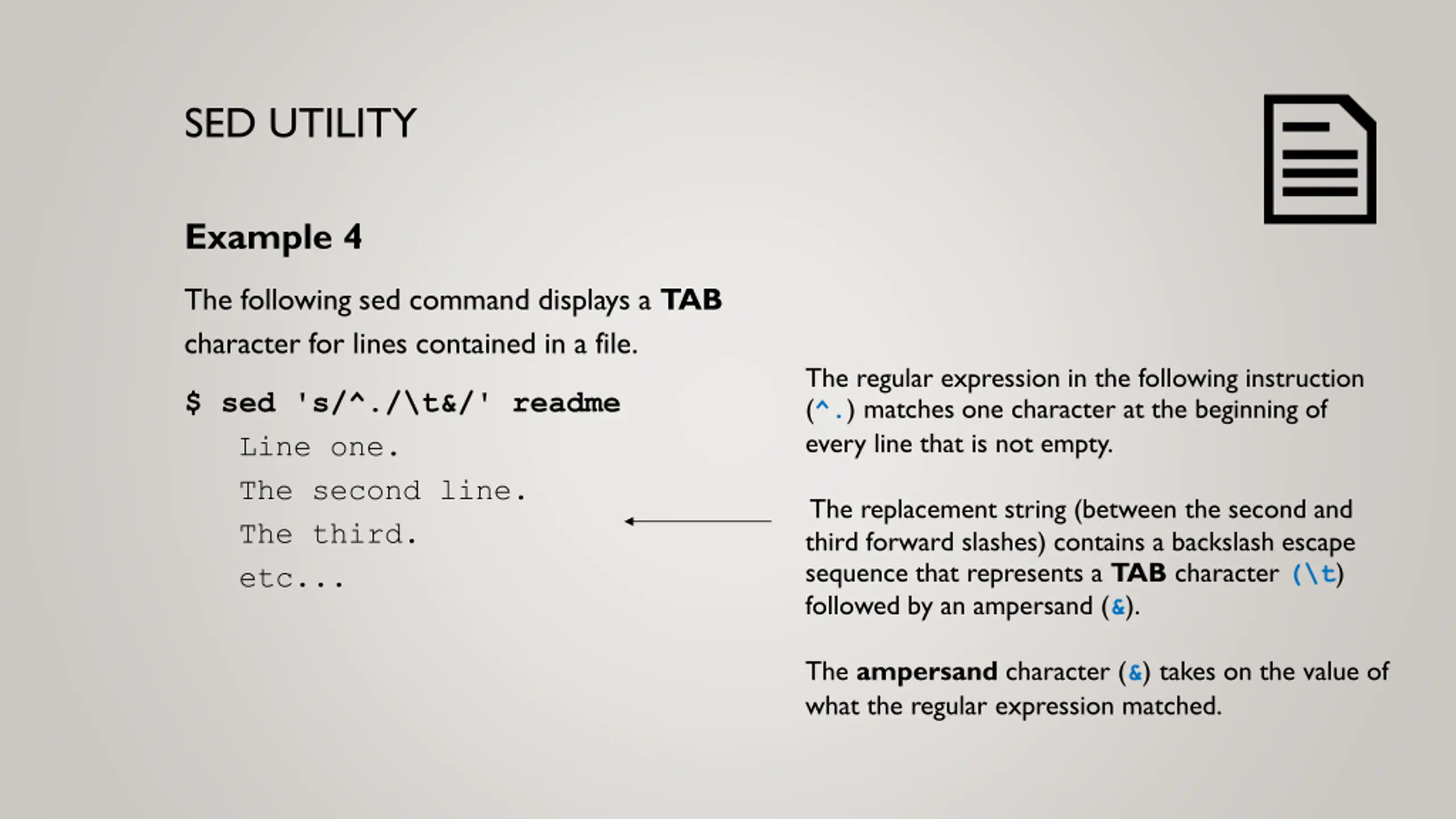SED UTILITY Example 4 The following sed command displays a TAB character for lines contained in a file. The regular expression in the following instruction (^.) matches one character at the beginning of every line that is not empty. $ sed 's/^./\t&/' readme Line one. The second line. The third. etc... The replacement string (between the second and third forward slashes) contains a backslash escape sequence that represents a TAB character (\t) followed by an ampersand (&). The ampersand character (&) takes on the value of what the regular expression matched.