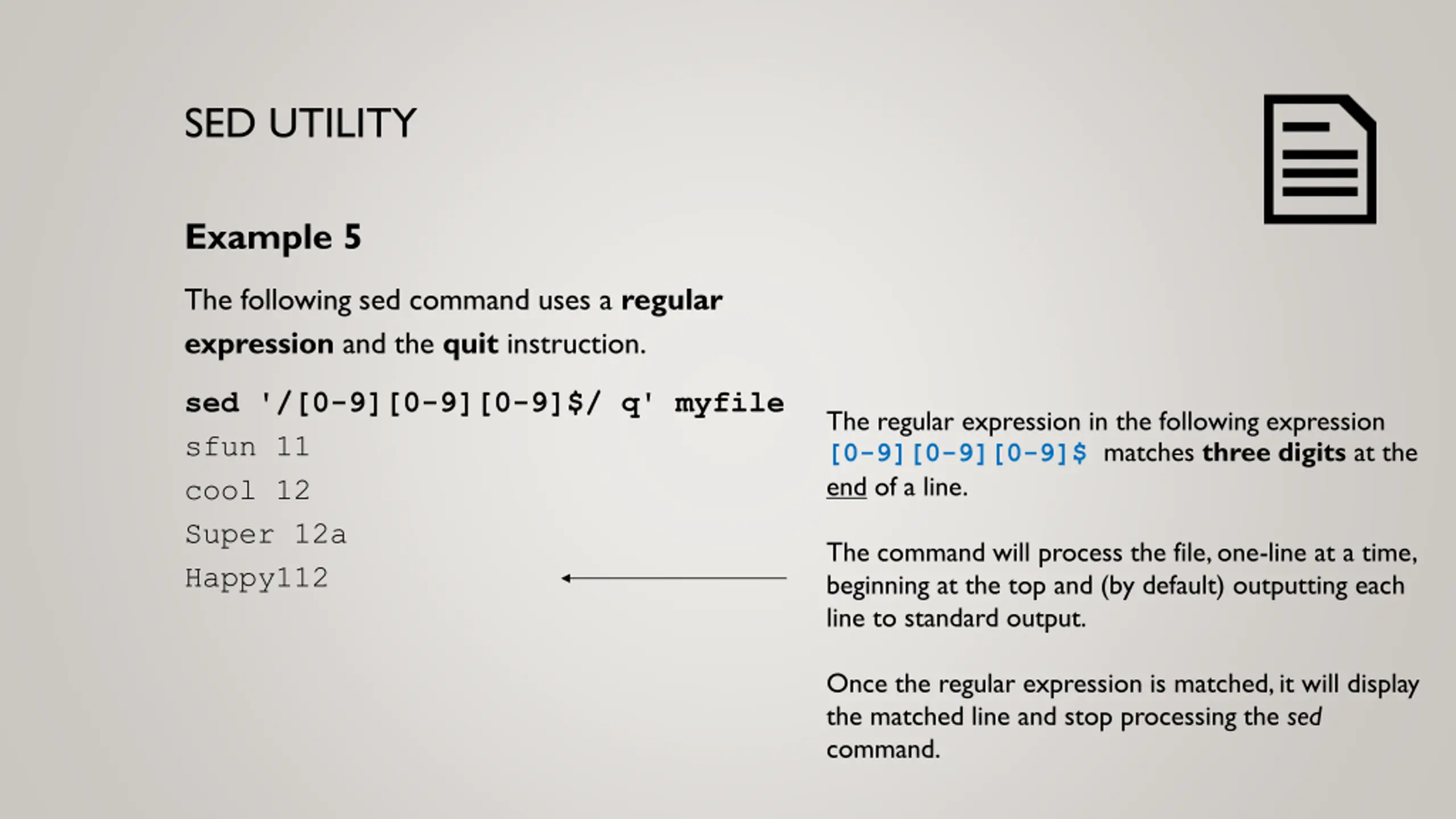 SED UTILITY Example 5 The following sed command uses a regular expression and the quit instruction. sed '/[0-9][0-9][0-9]$/ q' myfile sfun 11 cool 12 Super 12a Happy112 The regular expression in the following expression [0-9][0-9][0-9]$ matches three digits at the end of a line. The command will process the file, one-line at a time, beginning at the top and (by default) outputting each line to standard output. Once the regular expression is matched, it will display the matched line and stop processing the sed command.