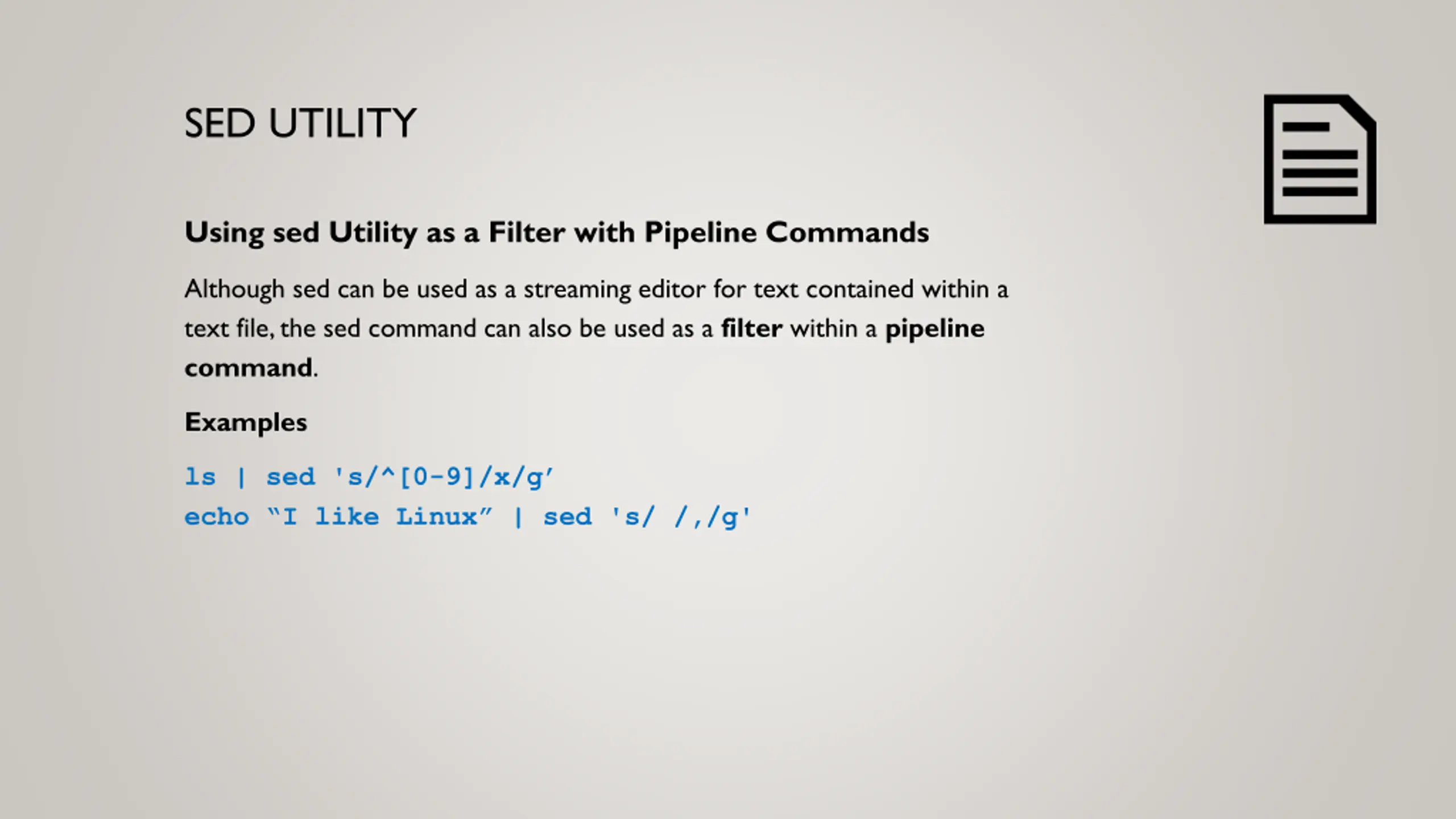 SED UTILITY Using sed Utility as a Filter with Pipeline Commands Although sed can be used as a streaming editor for text contained within a text file, the sed command can also be used as a filter within a pipeline command. Examples ls | sed 's/^[0-9]/x/g echo I like Linux | sed 's/ /,/g'