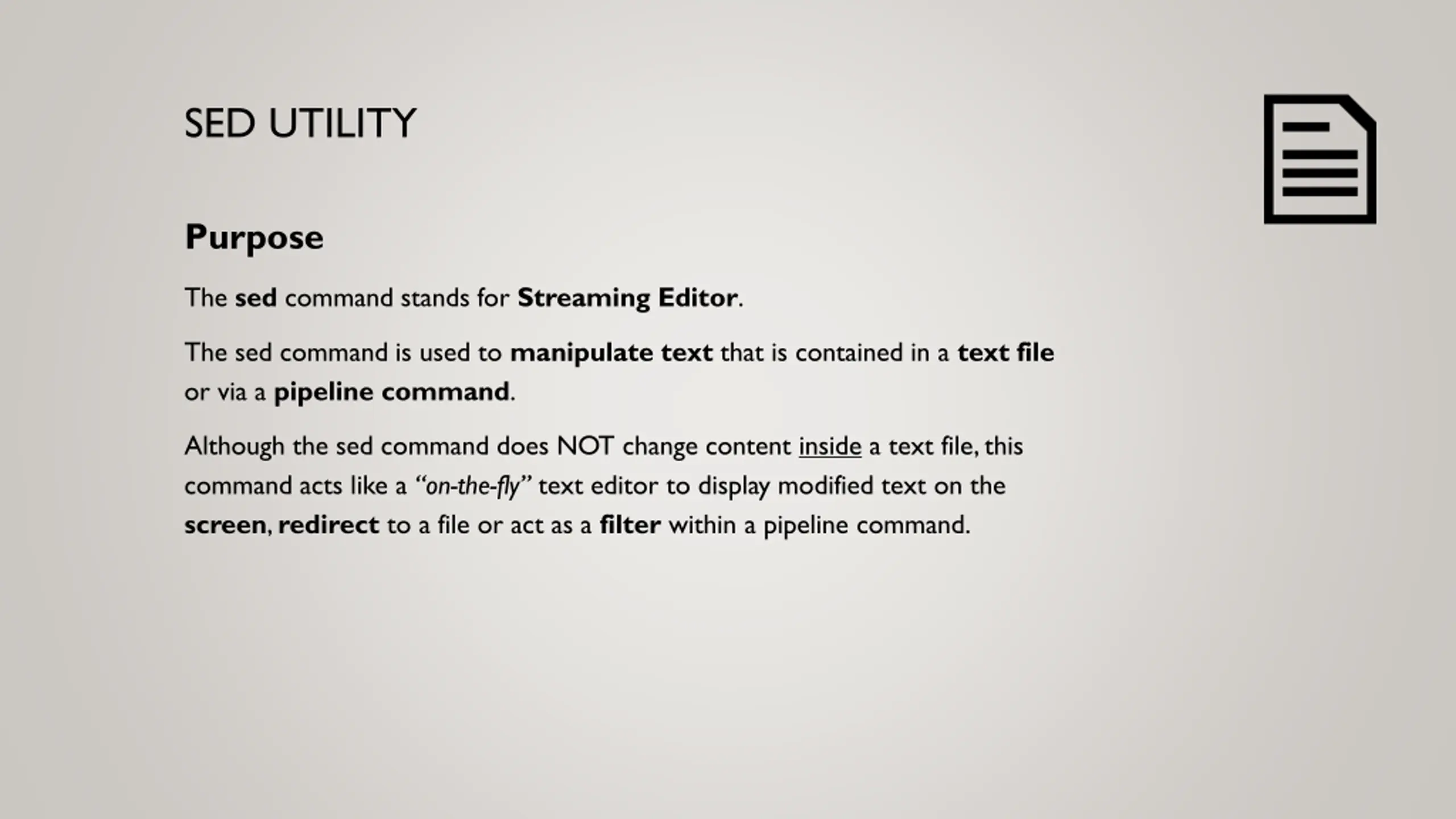 SED UTILITY Purpose The sed command stands for Streaming Editor. The sed command is used to manipulate text that is contained in a text file or via a pipeline command. Although the sed command does NOT change content inside a text file, this command acts like a on-the-fly text editor to display modified text on the screen, redirect to a file or act as a filter within a pipeline command.