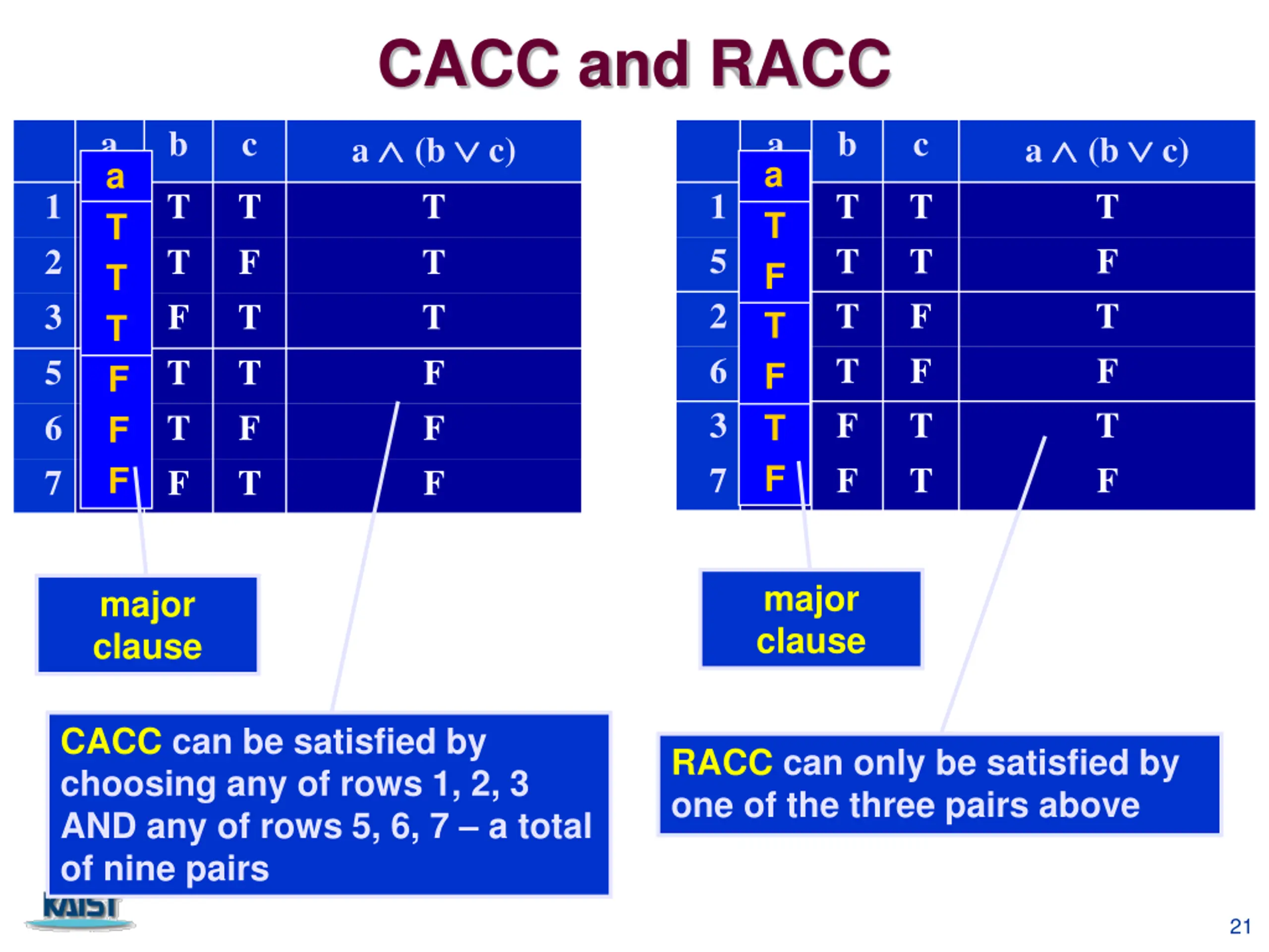 Restricted Active Clause Coverage Restricted Active Clause Coverage (RACC) : For each p in P and each major clause ci in Cp, choose minor clauses cj, j != i, so that ci determines p. TR has two requirements for each ci: ci evaluates to true and ci evaluates to false. The values chosen for the minor clauses cj must be the same when ci is true as when ci is false, that is, it is required that cj(ci = true) = cj(ci = false) for all cj. This has been a common interpretation of MCDC by aviation developers Often called unique-cause MCDC RACC often leads to infeasible test requirements