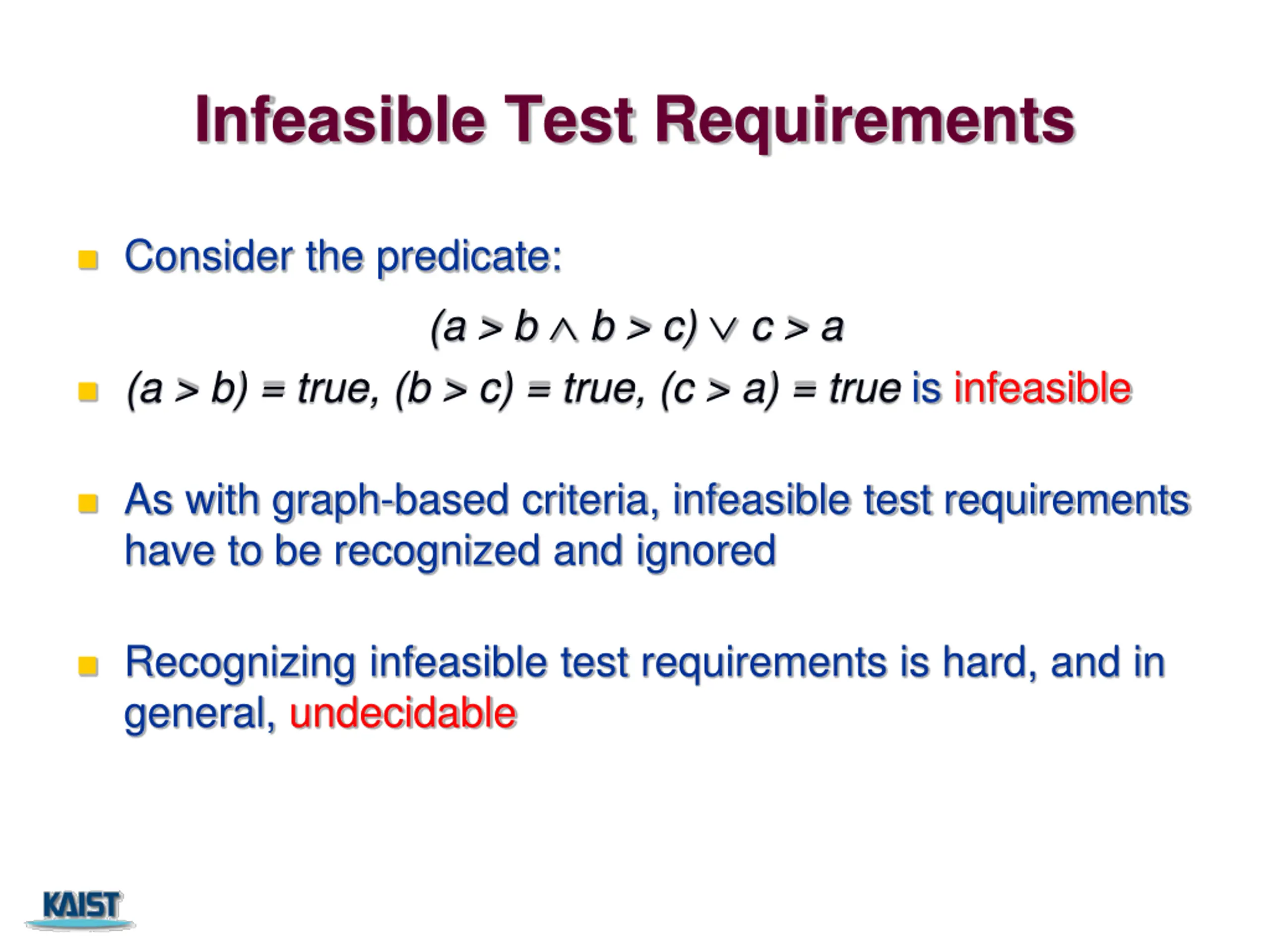 Infeasible Test Requirements Consider the predicate: (a > b b > c) c > a (a > b) = true, (b > c) = true, (c > a) = true is infeasible As with graph-based criteria, infeasible test requirements have to be recognized and ignored Recognizing infeasible test requirements is hard, and in general, undecidable