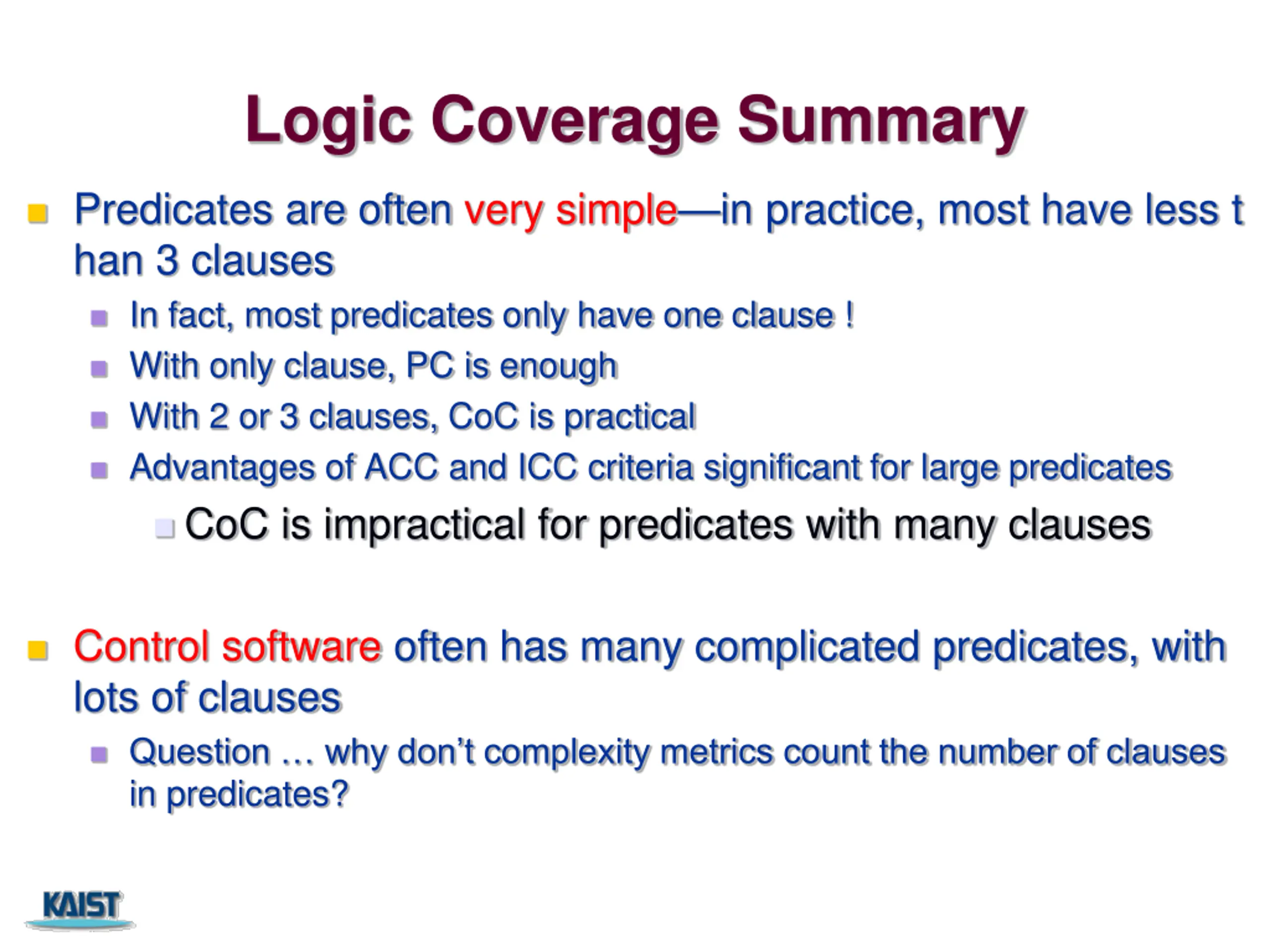 Logic Coverage Summary Predicates are often very simple in practice, most have less t han 3 clauses In fact, most predicates only have one clause ! With only clause, PC is enough With 2 or 3 clauses, CoC is practical Advantages of ACC and ICC criteria significant for large predicates CoC is impractical for predicates with many clauses Control software often has many complicated predicates, with lots of clauses Question why don t complexity metrics count the number of clauses in predicates?