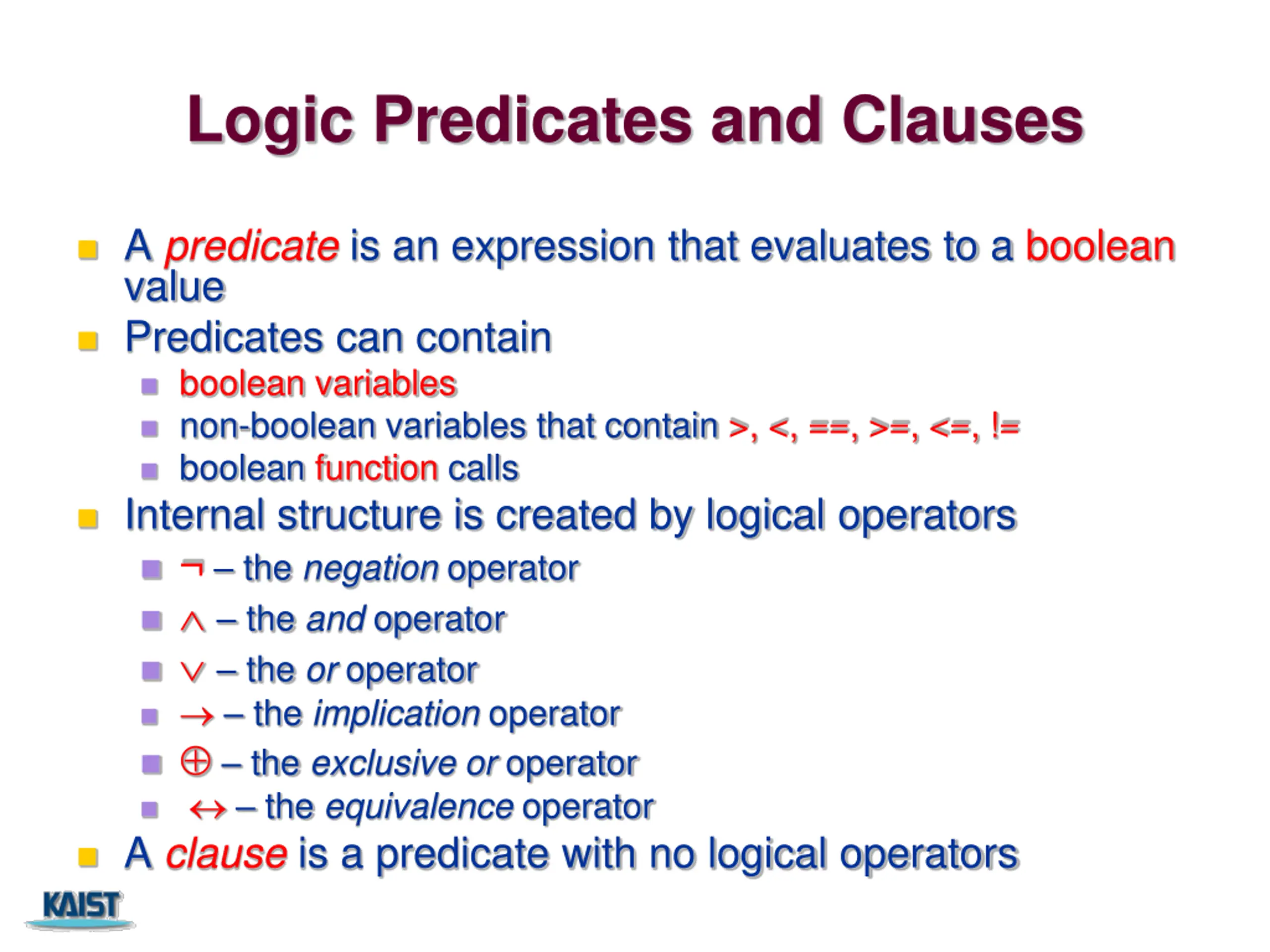 Logic Predicates and Clauses A predicate is an expression that evaluates to a boolean value Predicates can contain boolean variables non-boolean variables that contain >, <, ==, >=, <=, != boolean function calls Internal structure is created by logical operators the negation operator the and operator the or operator the implication operator the exclusive or operator the equivalence operator A clause is a predicate with no logical operators