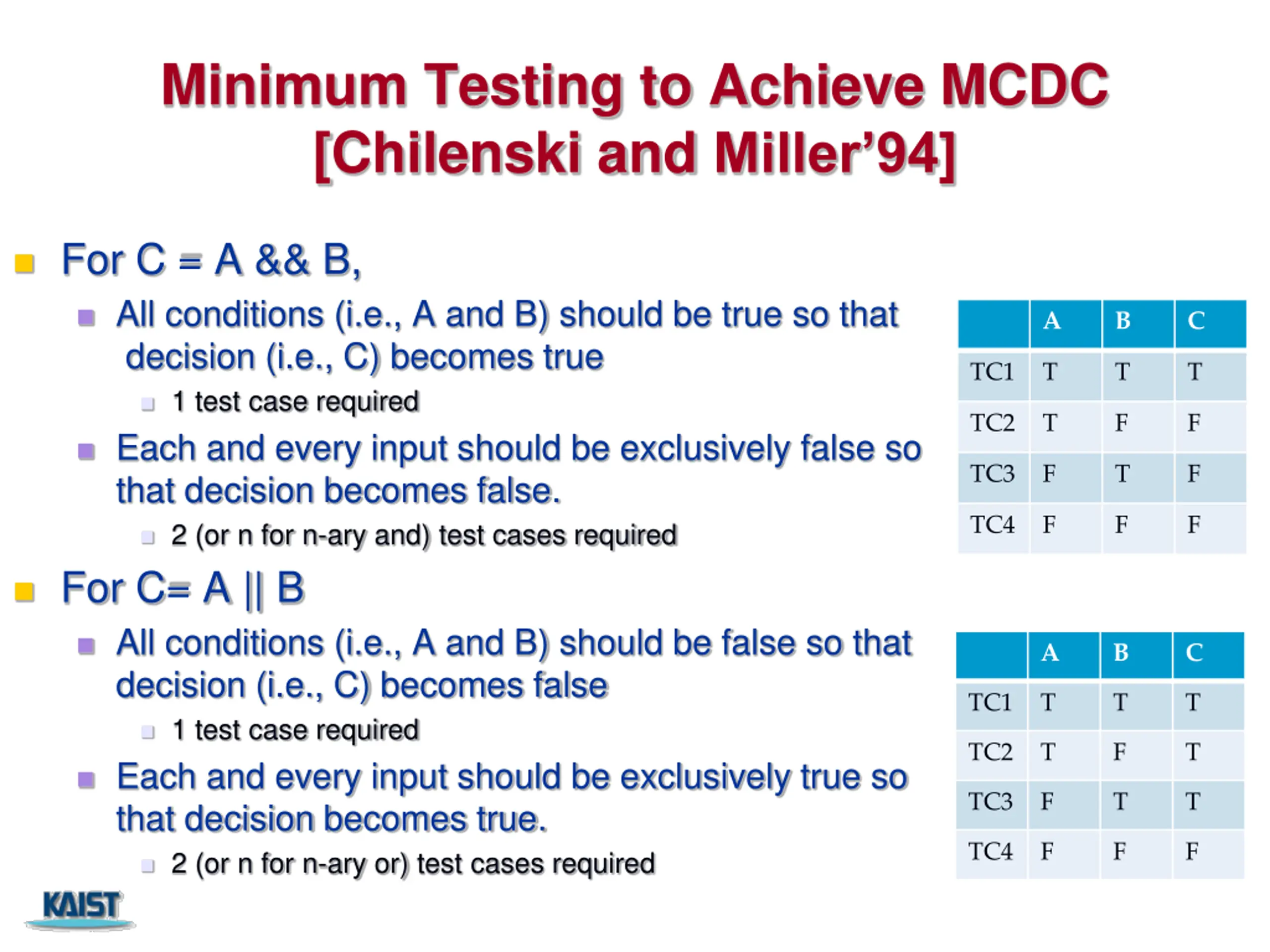 Minimum Testing to Achieve MCDC [Chilenski and Miller 94] For C = A && B, All conditions (i.e., A and B) should be true so that decision (i.e., C) becomes true 1 test case required Each and every input should be exclusively false so that decision becomes false. 2 (or n for n-ary and) test cases required For C= A || B All conditions (i.e., A and B) should be false so that decision (i.e., C) becomes false 1 test case required Each and every input should be exclusively true so that decision becomes true. 2 (or n for n-ary or) test cases required A B C TC1 T T T TC2 T F F TC3 F T F TC4 F F F A B C TC1 T T T TC2 T F T TC3 F T T TC4 F F F