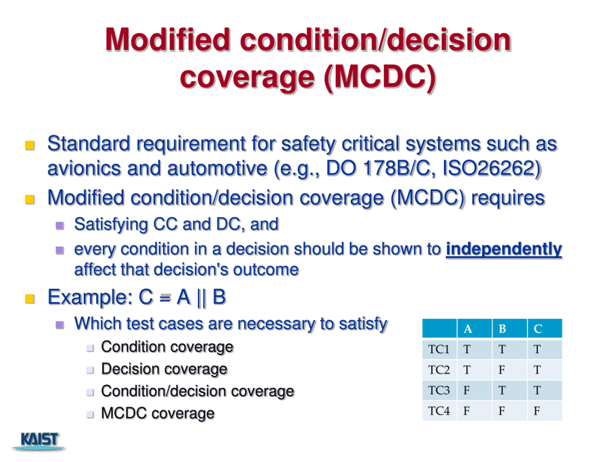 Modified condition/decision coverage (MCDC) Standard requirement for safety critical systems such as avionics and automotive (e.g., DO 178B/C, ISO26262) Modified condition/decision coverage (MCDC) requires Satisfying CC and DC, and every condition in a decision should be shown to independently affect that decision's outcome Example: C = A || B Which test cases are necessary to satisfy Condition coverage Decision coverage Condition/decision coverage MCDC coverage A B C TC1 T T T TC2 T F T TC3 F T T TC4 F F F
