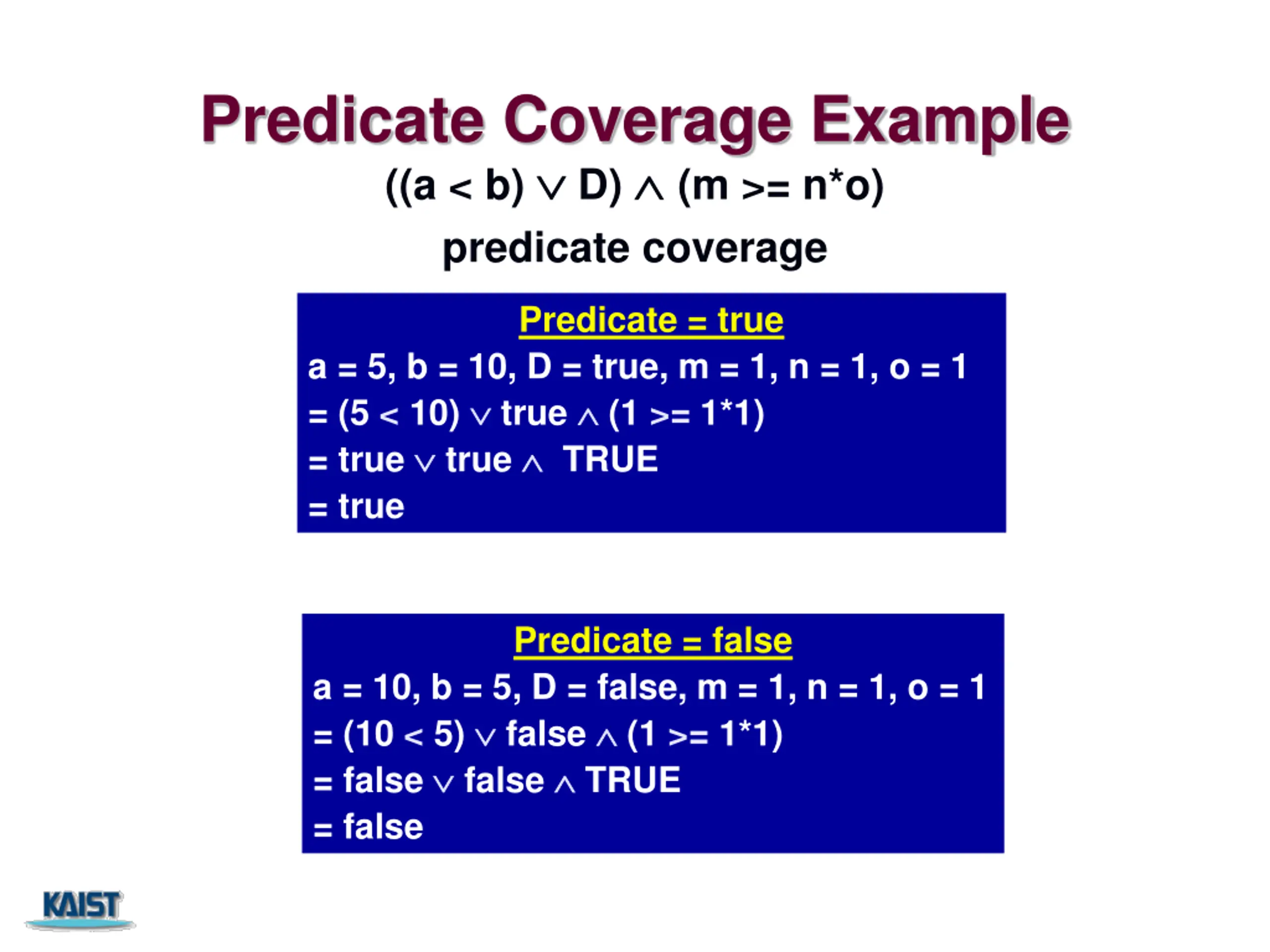 Predicate Coverage Example ((a < b) D) (m >= n*o) predicate coverage Predicate = true a = 5, b = 10, D = true, m = 1, n = 1, o = 1 = (5 < 10) true (1 >= 1*1) = true true TRUE = true Predicate = false a = 10, b = 5, D = false, m = 1, n = 1, o = 1 = (10 < 5) false (1 >= 1*1) = false false TRUE = false