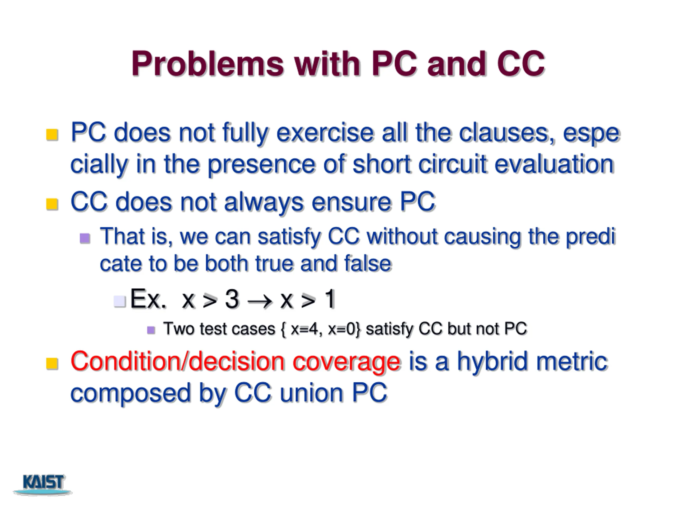 Problems with PC and CC PC does not fully exercise all the clauses, espe cially in the presence of short circuit evaluation CC does not always ensure PC That is, we can satisfy CC without causing the predi cate to be both true and false Ex. x > 3 x > 1 Two test cases { x=4, x=0} satisfy CC but not PC Condition/decision coverage is a hybrid metric composed by CC union PC