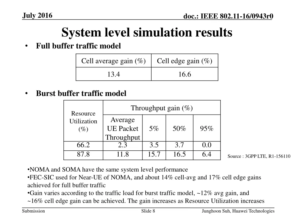 July 2016 doc.: IEEE 802.11-16/0943r0 SOMA Semi-Orthogonal Multiple Access Superposition transmission with adaptive power ratio on component constellations and Gray-mapped superposed constellation For Near-UE to decode Near-UE bits, Far-UE bits Not need to be known Far-UE bits Near-UE bits The Far-UE decodes its own signal, and treats Near-UE as noise just like NOMA (1011) (1001) (0001) (0011) (1010) (1010) (1000) (0000) (0010) The Near-UE performs the demodulation of the received signal, collecting the LLRs corresponding to the near coded bits, and then performs decoding of the near-UE codeword. (1110) (1100) (0100) (0110) Complexity in the Receiver side is reduced (1111) (1101) (0101) (0111) Example of SOMA superposed constellation Submission Slide 7 Junghoon Suh, Huawei Technologies
