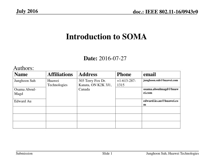 July 2016 doc.: IEEE 802.11-16/0943r0 Introduction to SOMA Date: 2016-07-27 Authors: Name Junghoon Suh Affiliations Address Huawei Technologies Phone +1-613-287- 1315 email junghoon.suh@huawei.com 303 Terry Fox Dr. Kanata, ON K2K 3J1, Canada osama.aboulmagd@huaw ei.com edward.ks.au@huawei.co m Osama Aboul- Magd Edward Au Submission Slide 1 Junghoon Suh, Huawei Technologies