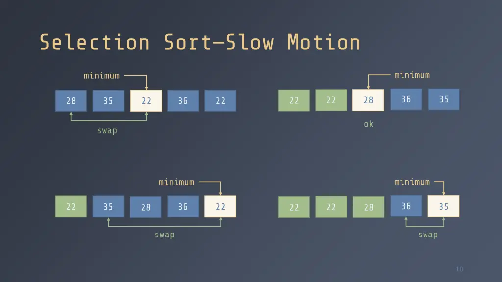 Selection SortSlow Motion minimum minimum 36 35 22 28 22 28 35 22 36 22 ok swap minimum minimum 36 35 22 35 36 22 22 28 22 28 swap swap 10