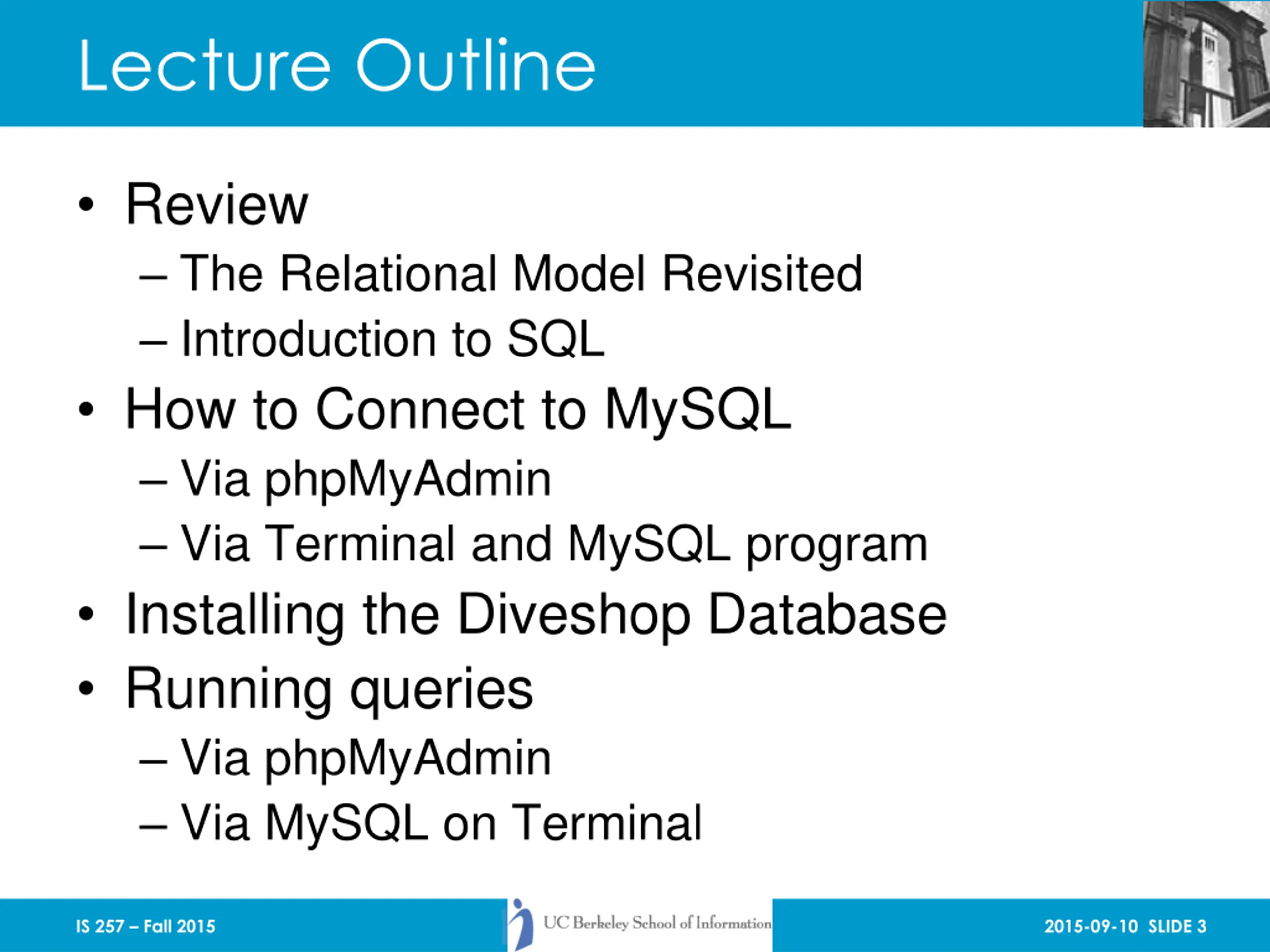 Lecture Outline Review The Relational Model Revisited Introduction to SQL How to Connect to MySQL Via phpMyAdmin Via Terminal and MySQL program Installing the Diveshop Database Running queries Via phpMyAdmin Via MySQL on Terminal IS 257 Fall 2015 2015-09-10 SLIDE 3