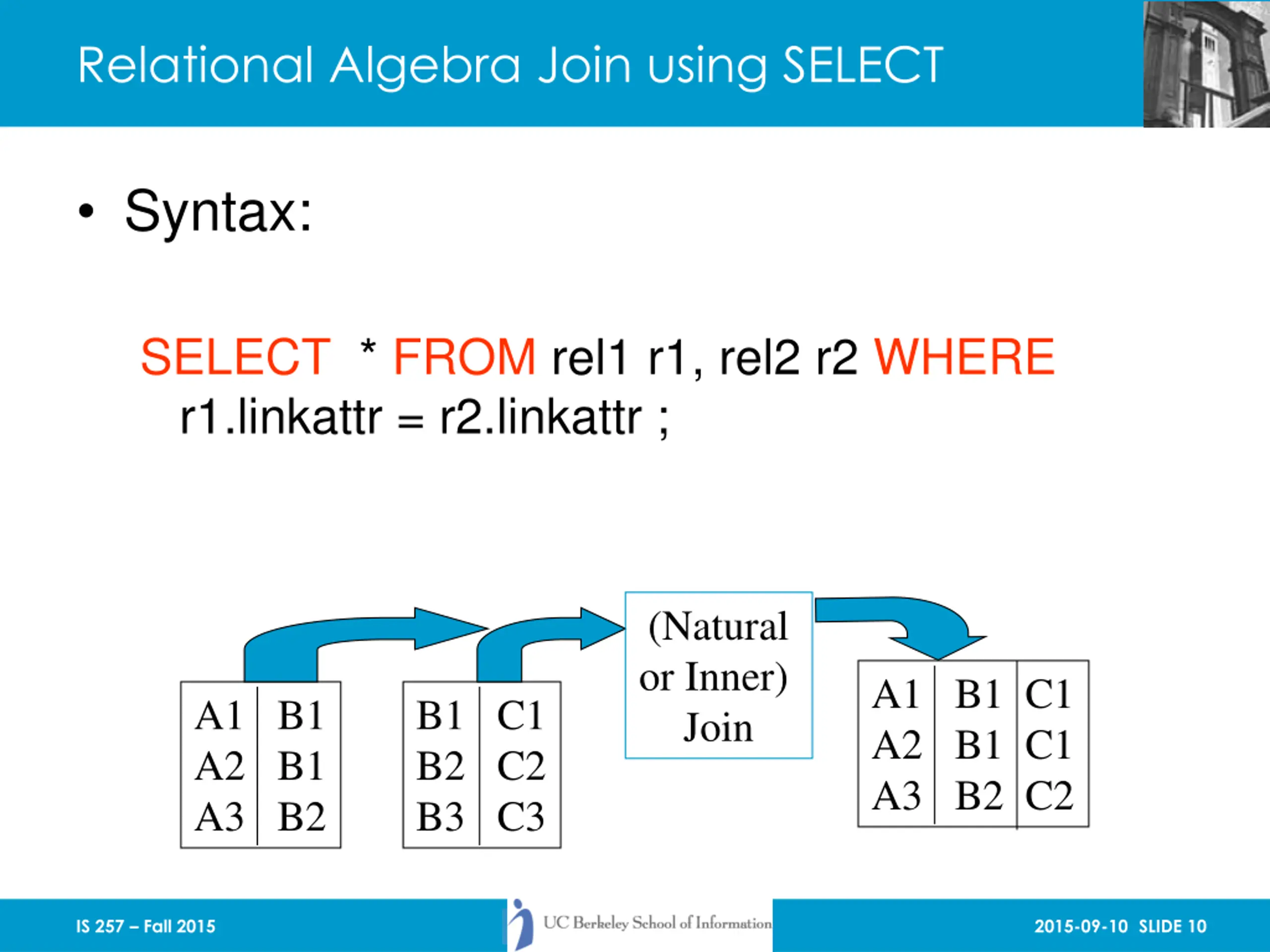 Relational Algebra Join using SELECT Syntax: SELECT * FROM rel1 r1, rel2 r2 WHERE r1.linkattr = r2.linkattr ; (Natural or Inner) Join A1 B1 C1 A2 B1 C1 A3 B2 C2 A1 B1 A2 B1 A3 B2 B1 C1 B2 C2 B3 C3 IS 257 Fall 2015 2015-09-10 SLIDE 10