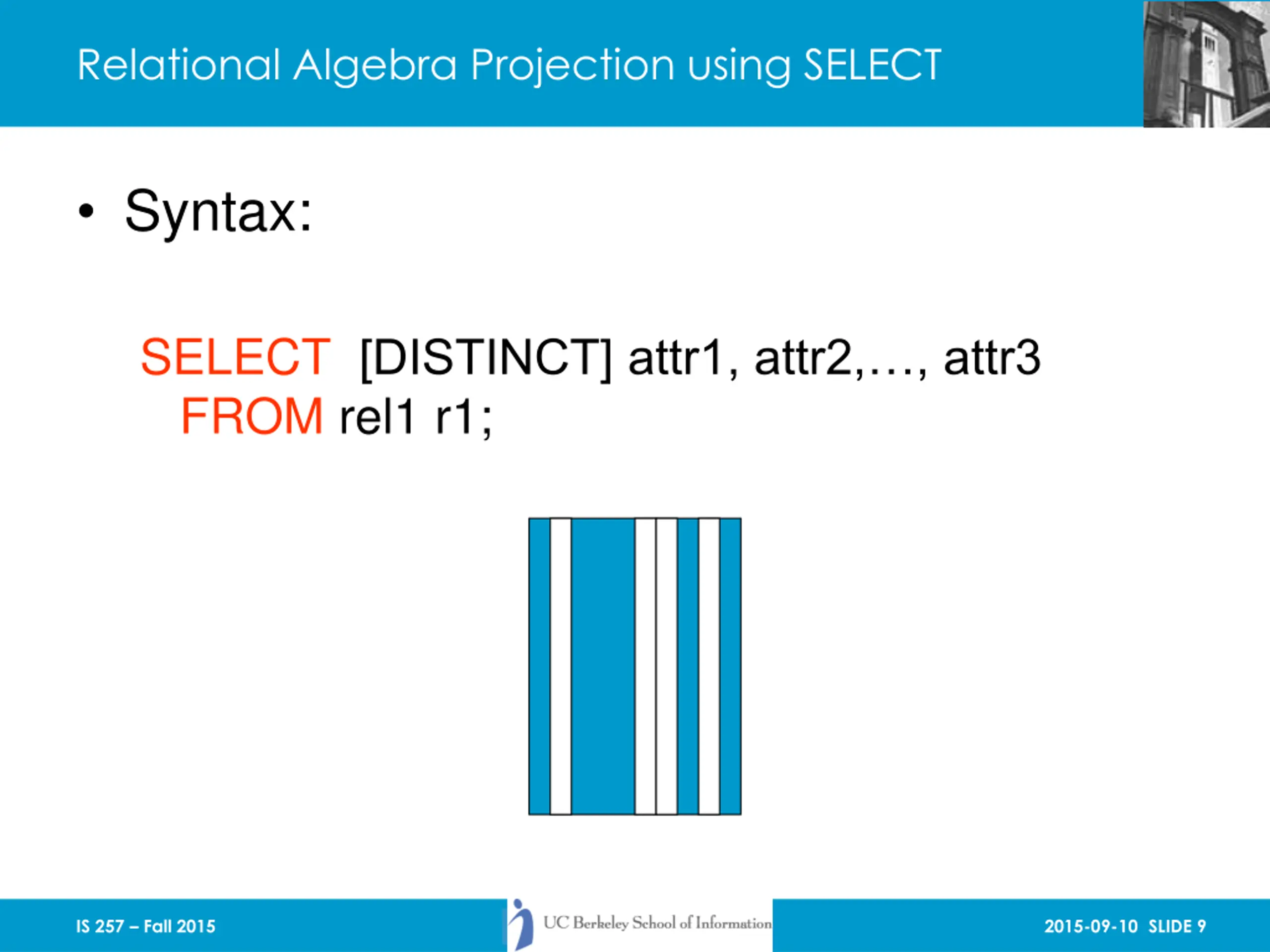 Relational Algebra Projection using SELECT Syntax: SELECT [DISTINCT] attr1, attr2, , attr3 FROM rel1 r1; IS 257 Fall 2015 2015-09-10 SLIDE 9