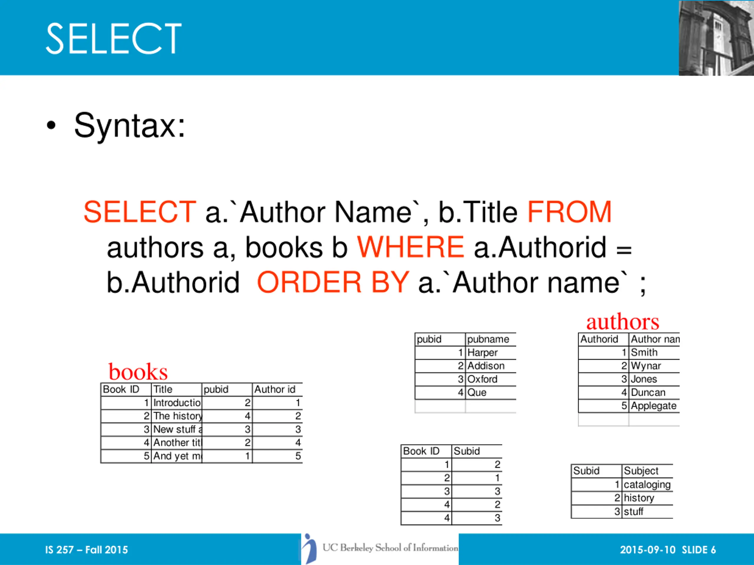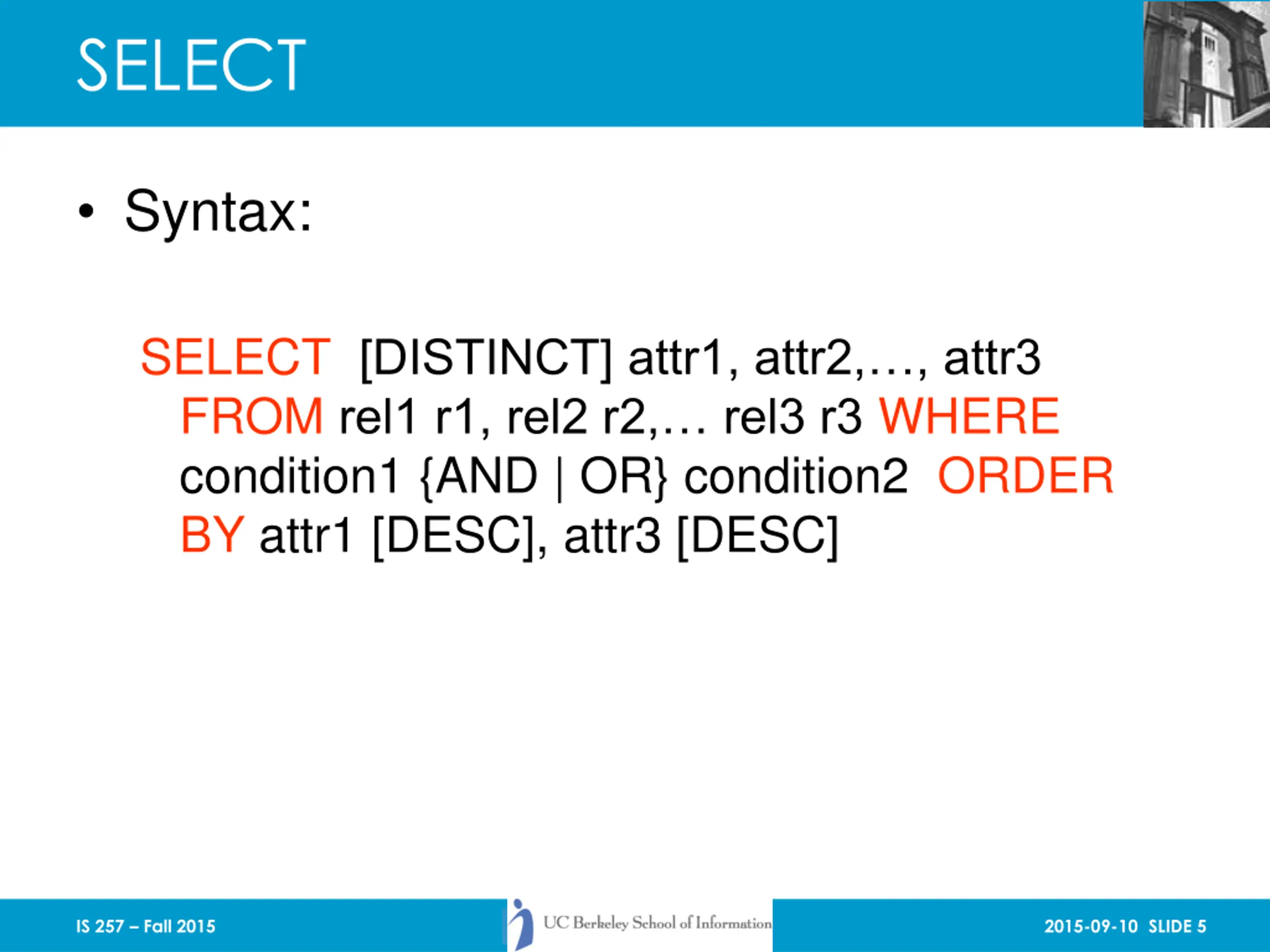 SELECT Syntax: SELECT [DISTINCT] attr1, attr2, , attr3 FROM rel1 r1, rel2 r2, rel3 r3 WHERE condition1 {AND | OR} condition2 ORDER BY attr1 [DESC], attr3 [DESC] IS 257 Fall 2015 2015-09-10 SLIDE 5