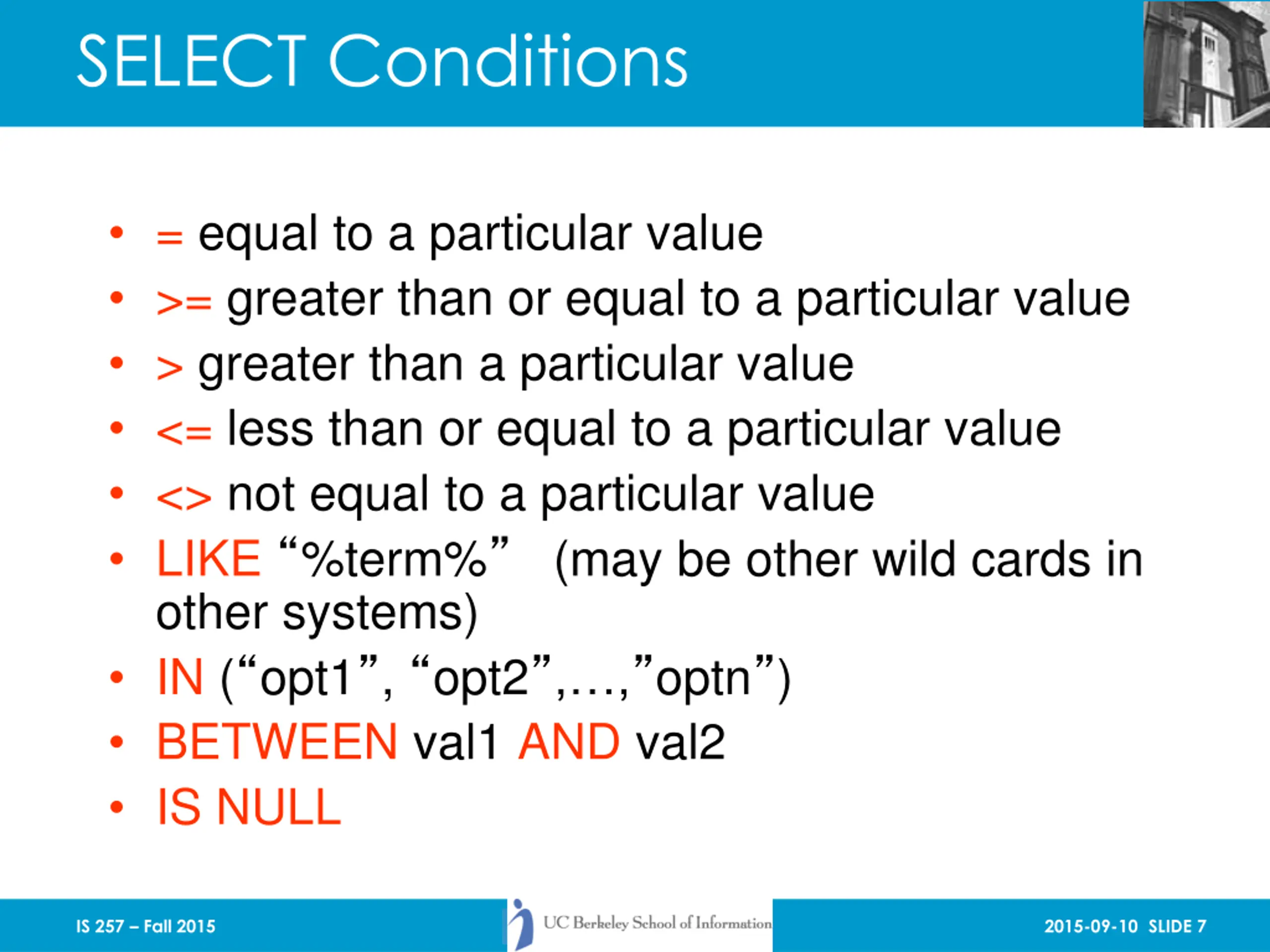 SELECT Conditions = equal to a particular value >= greater than or equal to a particular value > greater than a particular value <= less than or equal to a particular value <> not equal to a particular value LIKE %term% (may be other wild cards in other systems) IN ( opt1 , opt2 , , optn ) BETWEEN val1 AND val2 IS NULL IS 257 Fall 2015 2015-09-10 SLIDE 7