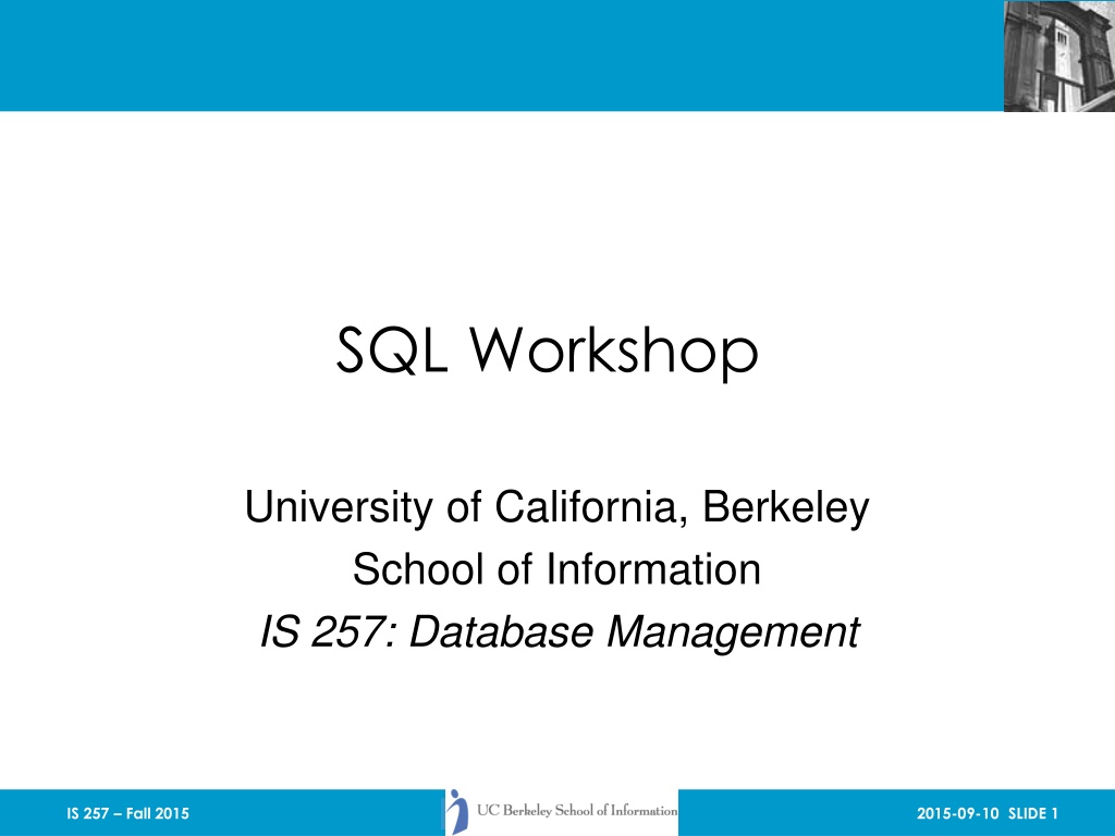 SQL Workshop University of California, Berkeley School of Information IS 257: Database Management IS 257 Fall 2015 2015-09-10 SLIDE 1