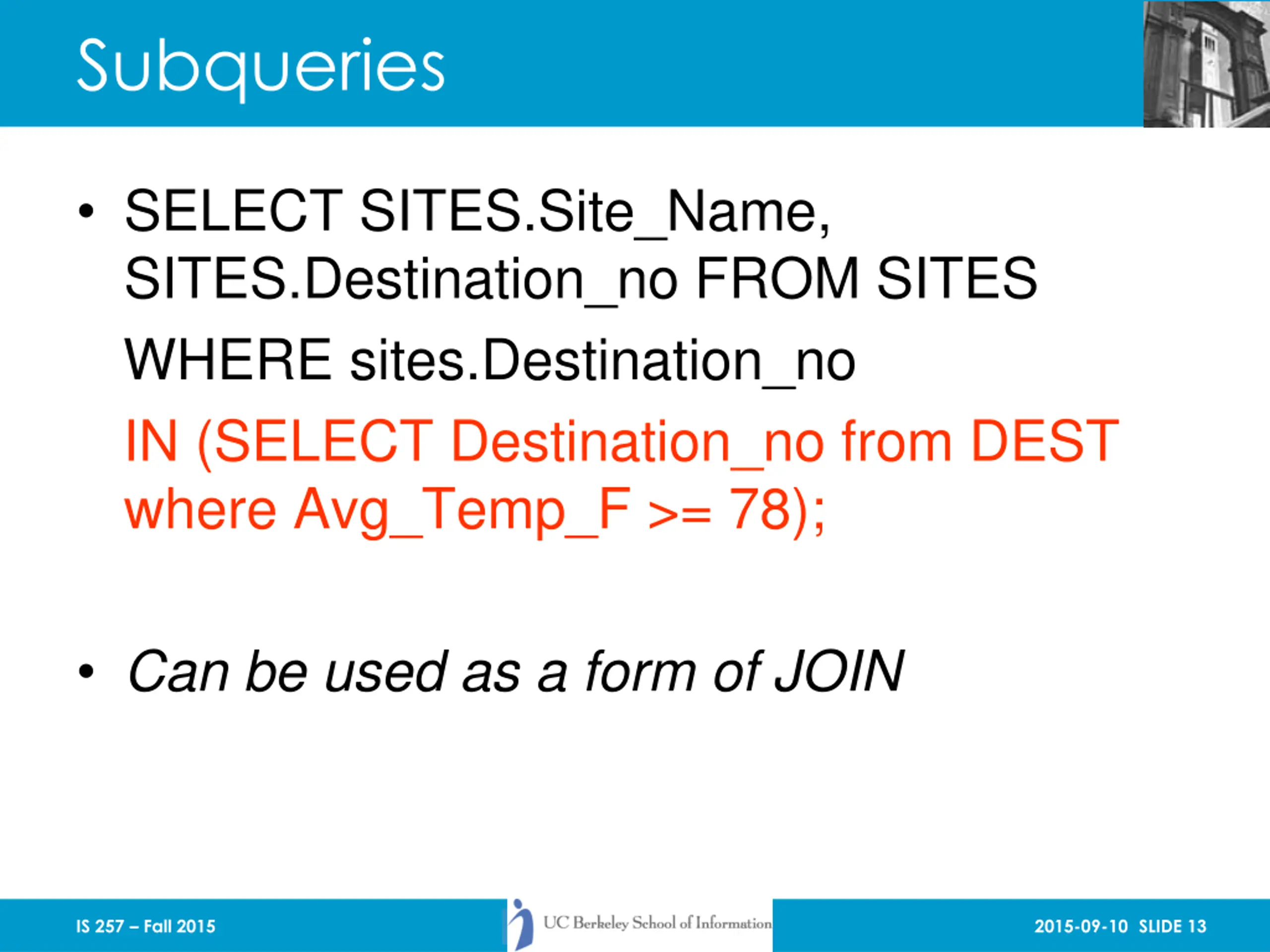 Subqueries SELECT SITES.Site_Name, SITES.Destination_no FROM SITES WHERE sites.Destination_no IN (SELECT Destination_no from DEST where Avg_Temp_F >= 78); Can be used as a form of JOIN IS 257 Fall 2015 2015-09-10 SLIDE 13