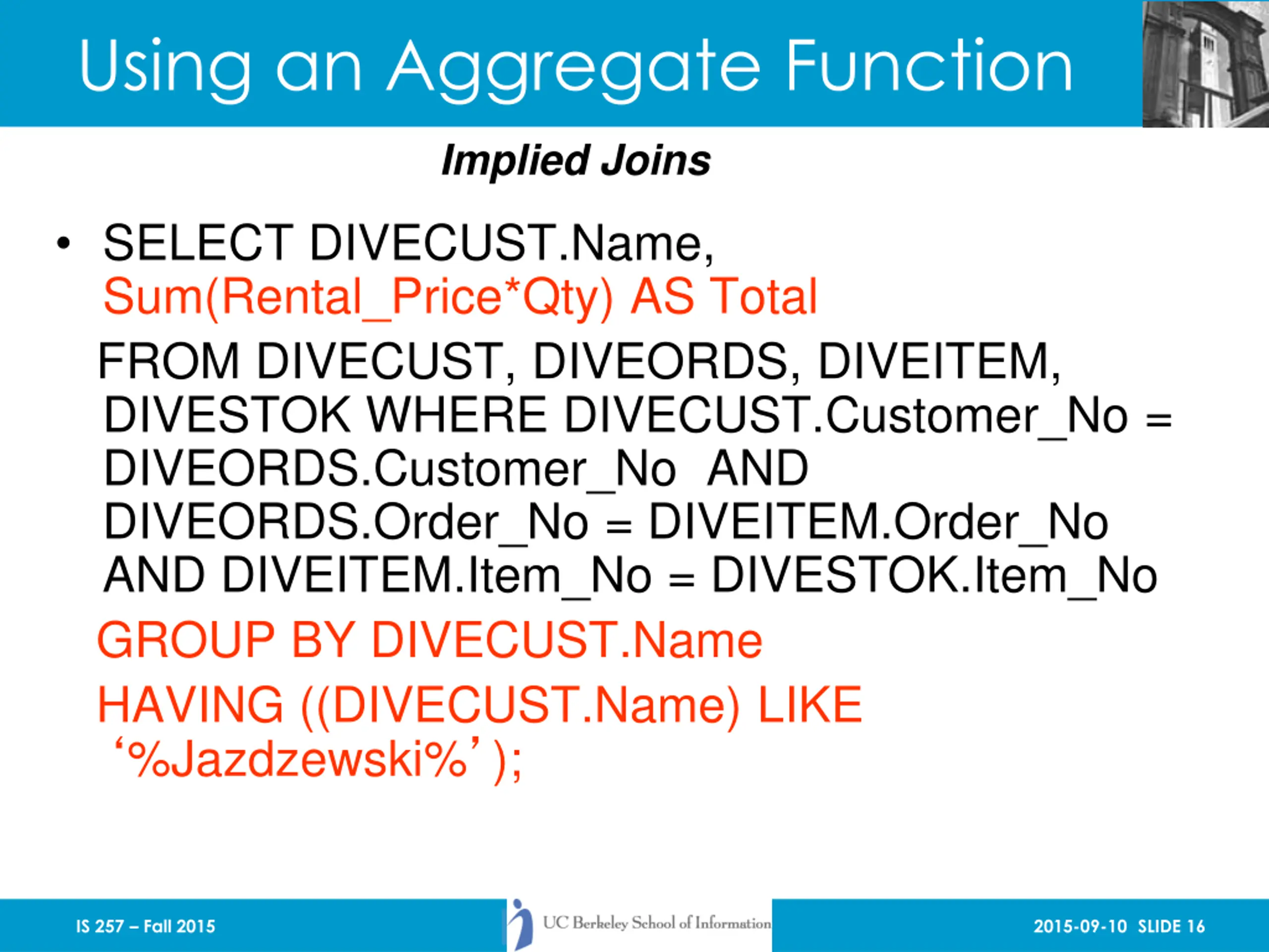 Using Aggregate functions SELECT attr1, Sum(attr2) AS name FROM tab1, tab2 ... GROUP BY attr1, attr3 HAVING condition; IS 257 Fall 2015 2015-09-10 SLIDE 15