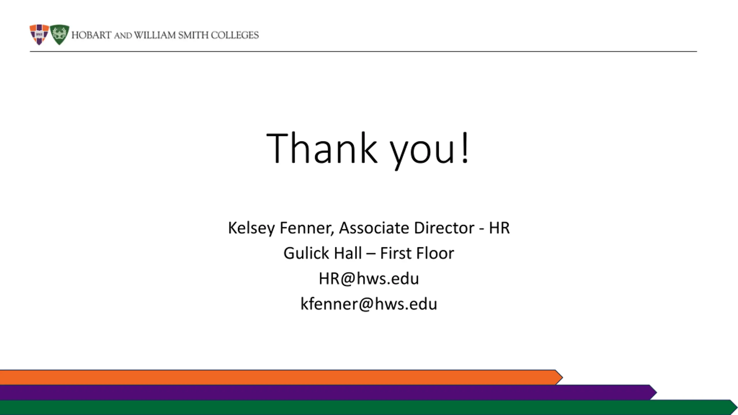 Thank you! Kelsey Fenner, Associate Director - HR Gulick Hall First Floor HR@hws.edu kfenner@hws.edu
