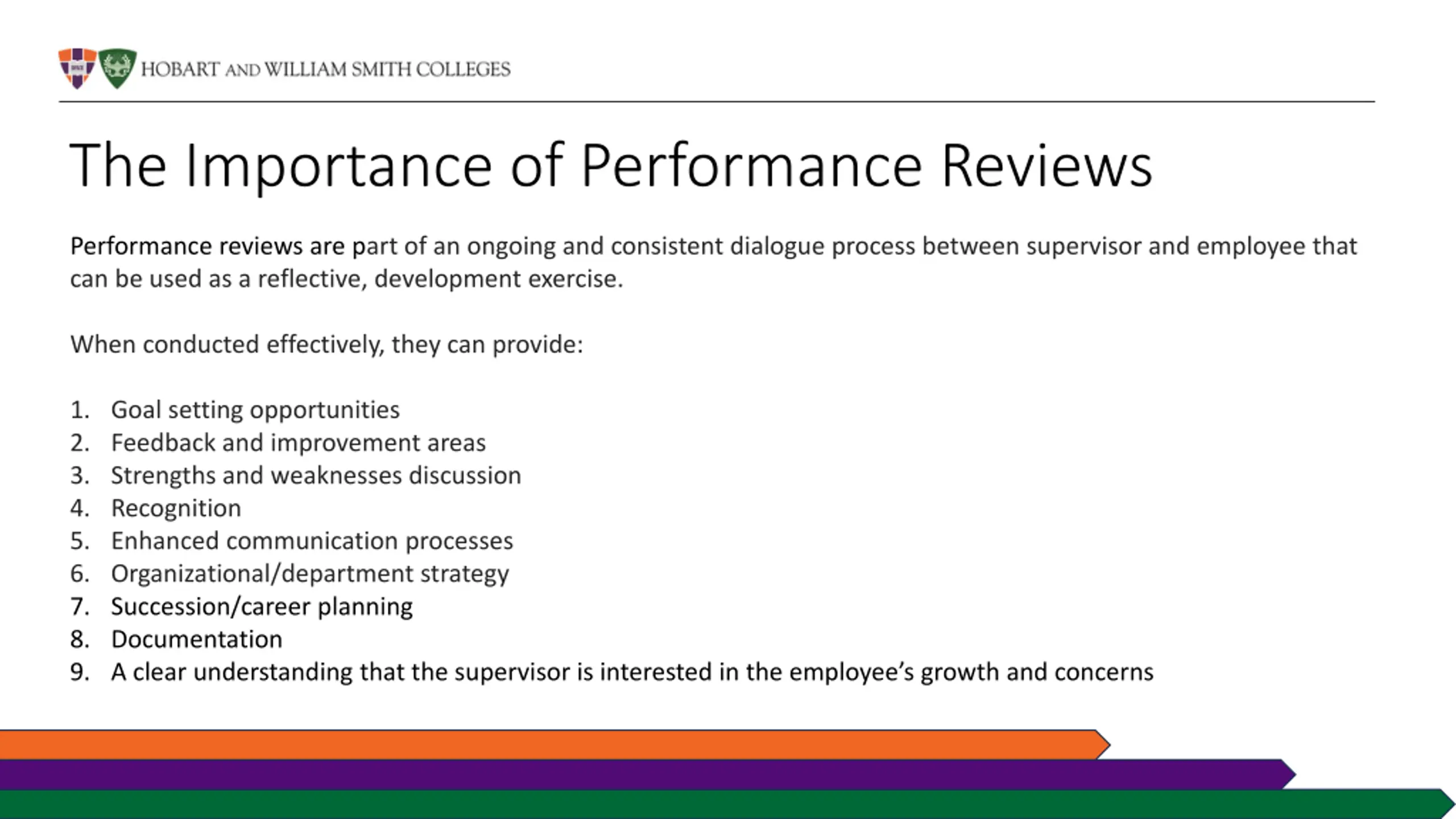 The Importance of Performance Reviews Performance reviews are part of an ongoing and consistent dialogue process between supervisor and employee that can be used as a reflective, development exercise. When conducted effectively, they can provide: 1. Goal setting opportunities 2. Feedback and improvement areas 3. Strengths and weaknesses discussion 4. Recognition 5. Enhanced communication processes 6. Organizational/department strategy 7. Succession/career planning 8. Documentation 9. A clear understanding that the supervisor is interested in the employee s growth and concerns