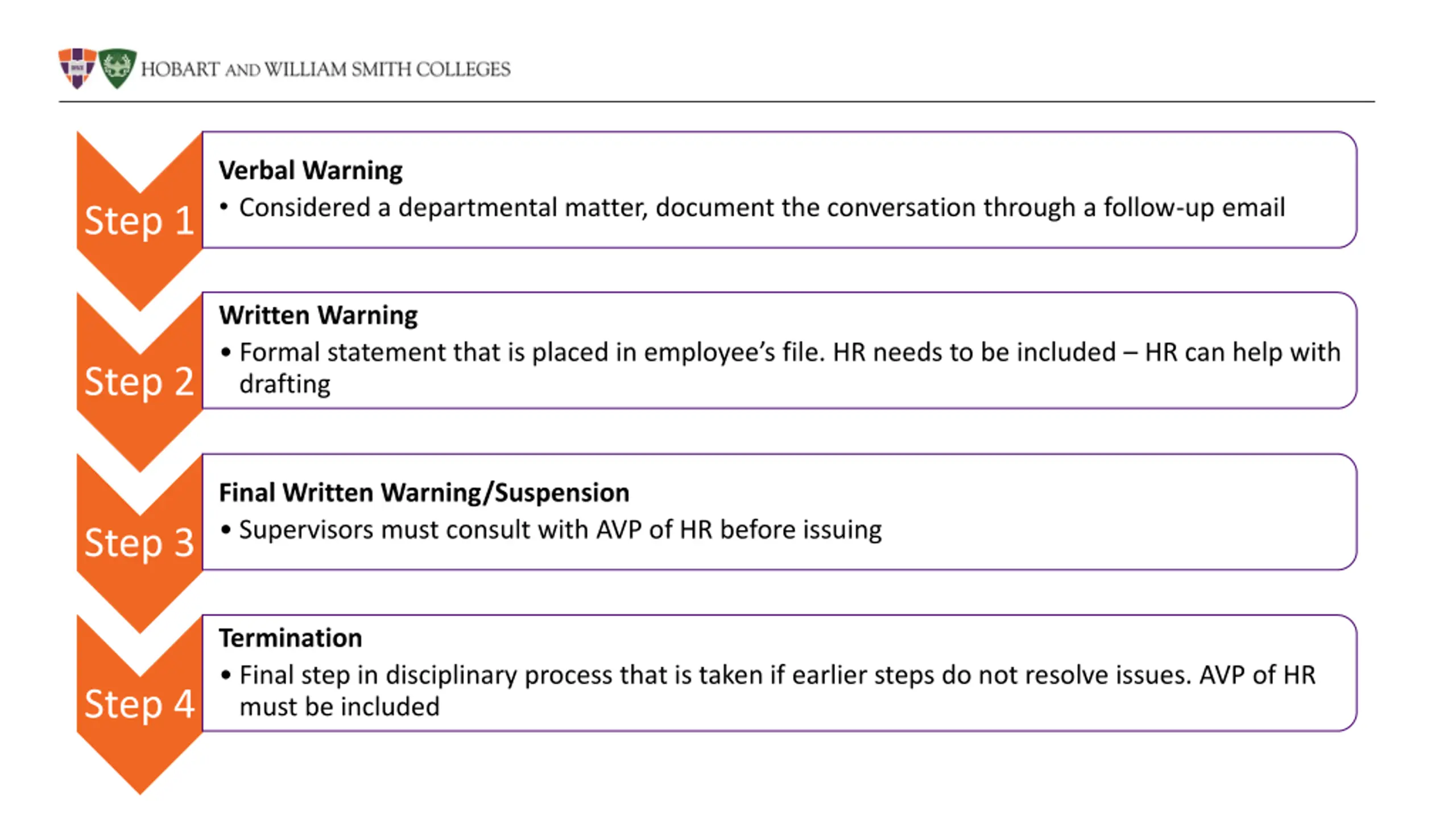 Verbal Warning Considered a departmental matter, document the conversation through a follow-up email Step 1 Written Warning Formal statement that is placed in employee s file. HR needs to be included HR can help with drafting Step 2 Final Written Warning/Suspension Supervisors must consult with AVP of HR before issuing Step 3 Termination Final step in disciplinary process that is taken if earlier steps do not resolve issues. AVP of HR must be included Step 4