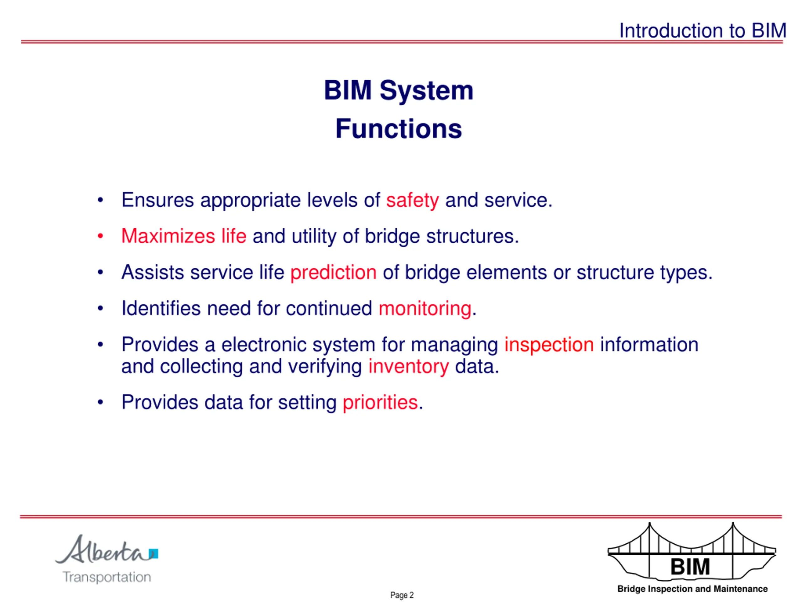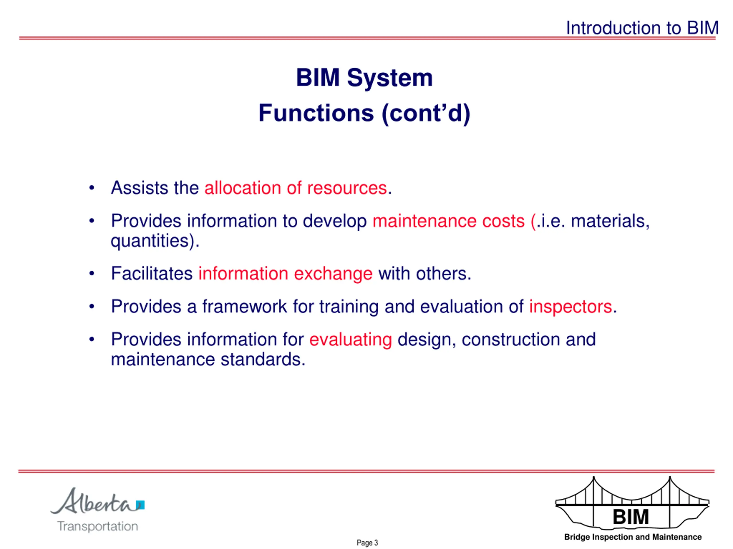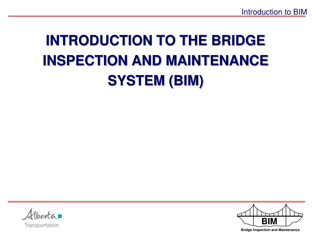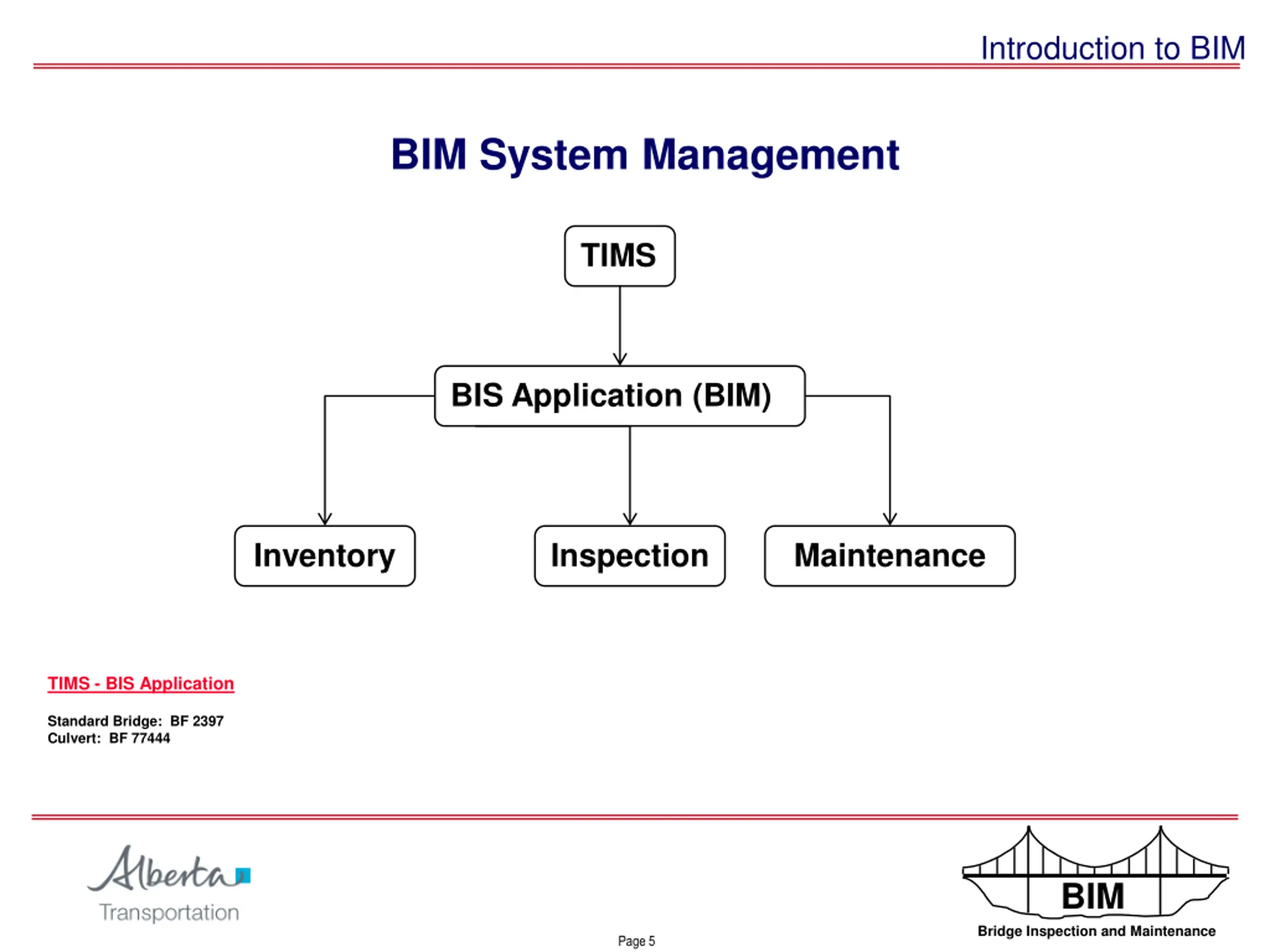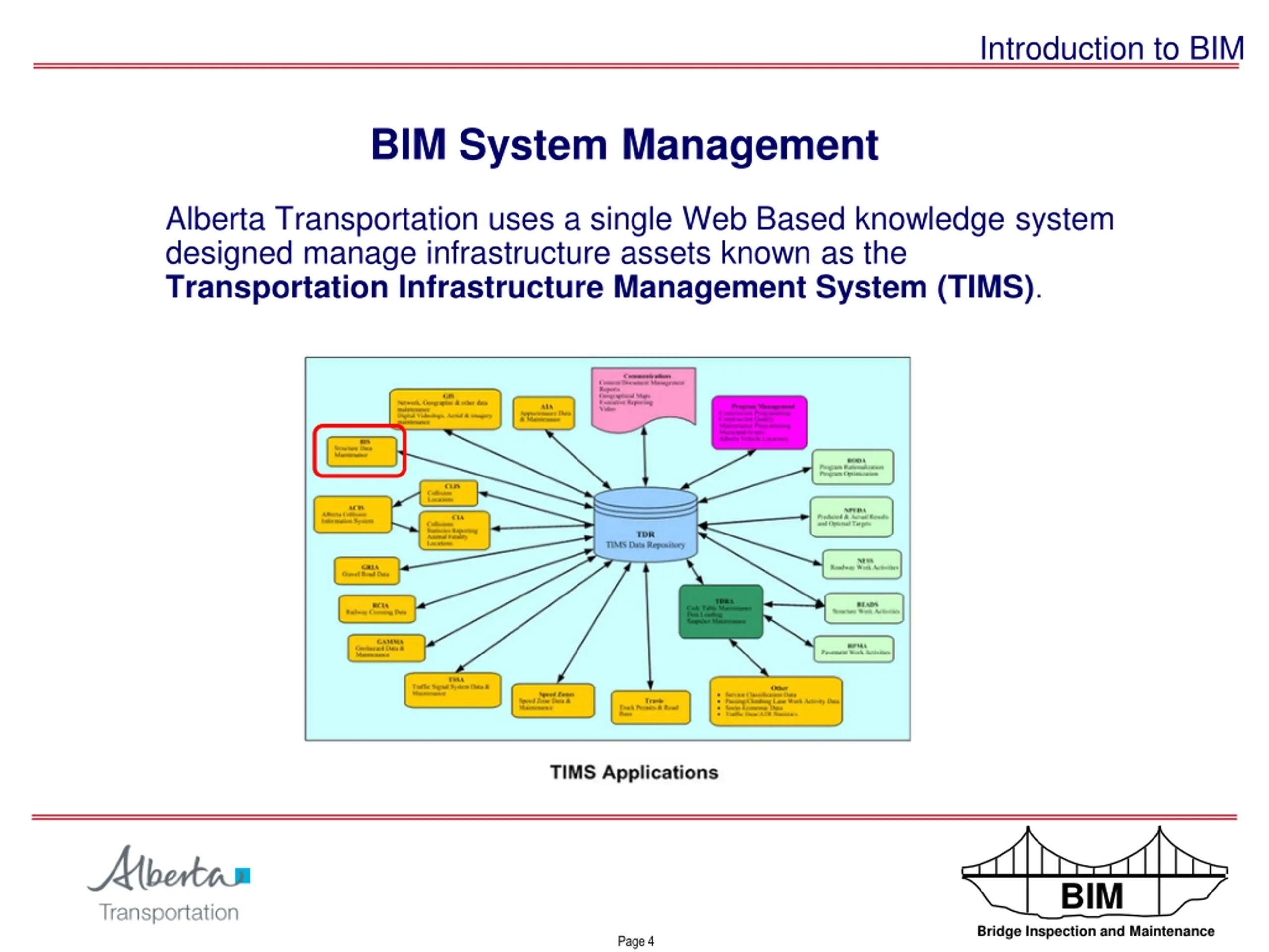 Introduction to BIM BIM System Management Alberta Transportation uses a single Web Based knowledge system designed manage infrastructure assets known as the Transportation Infrastructure Management System (TIMS). BIM Bridge Inspection and Maintenance Page 4