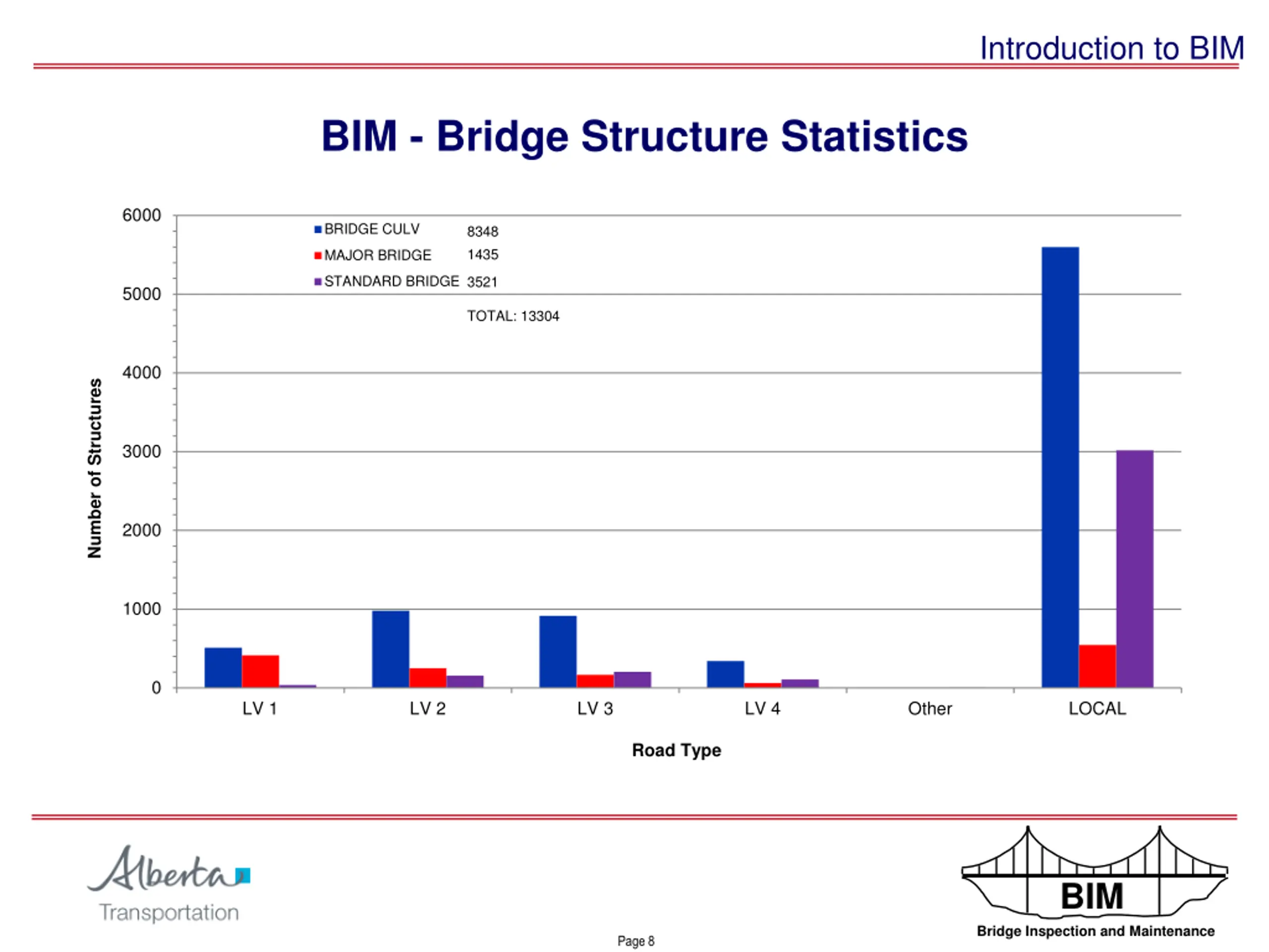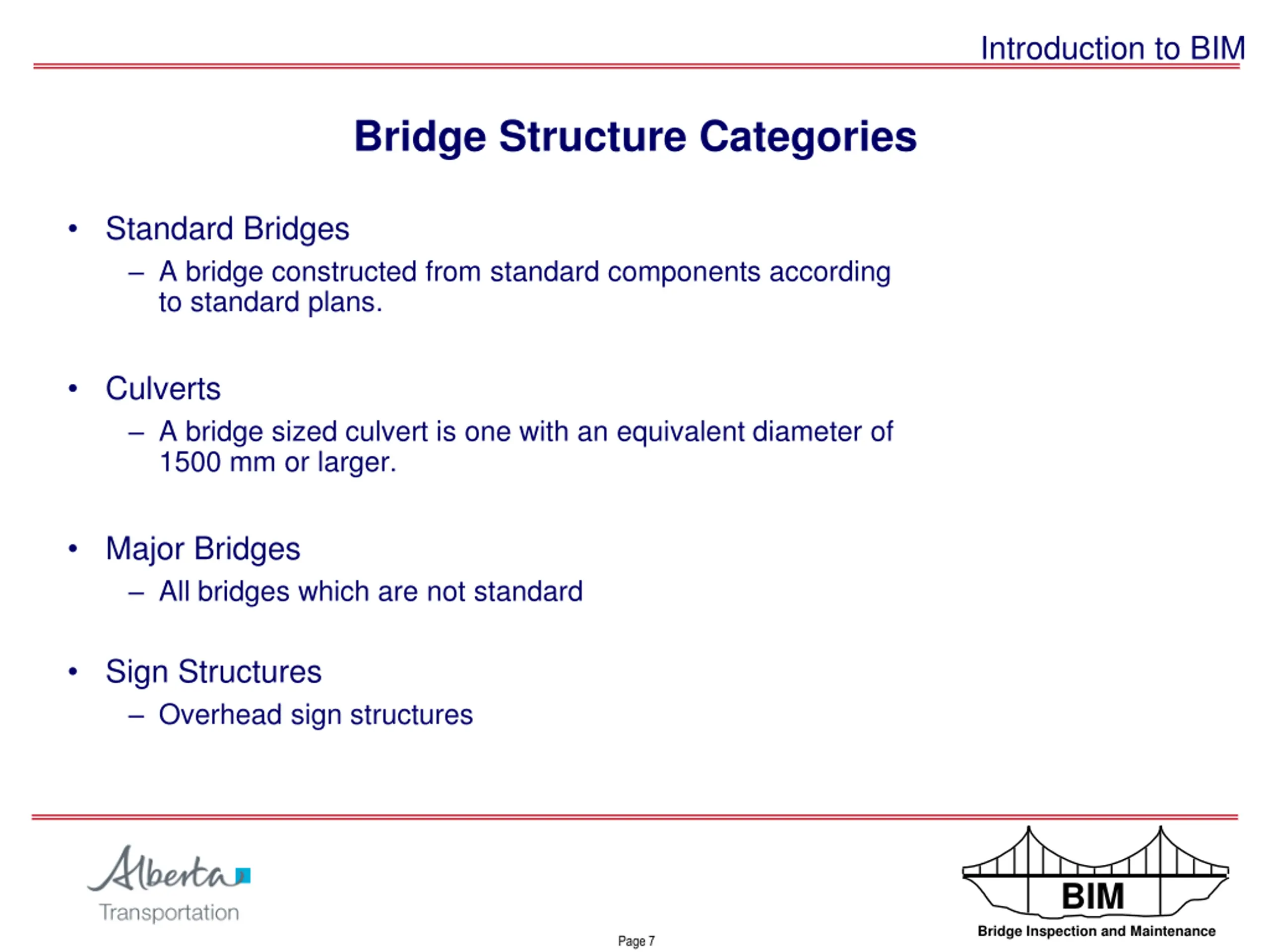 Introduction to BIM Bridge Structure Categories Standard Bridges A bridge constructed from standard components according to standard plans. Culverts A bridge sized culvert is one with an equivalent diameter of 1500 mm or larger. Major Bridges All bridges which are not standard Sign Structures Overhead sign structures BIM Bridge Inspection and Maintenance Page 7
