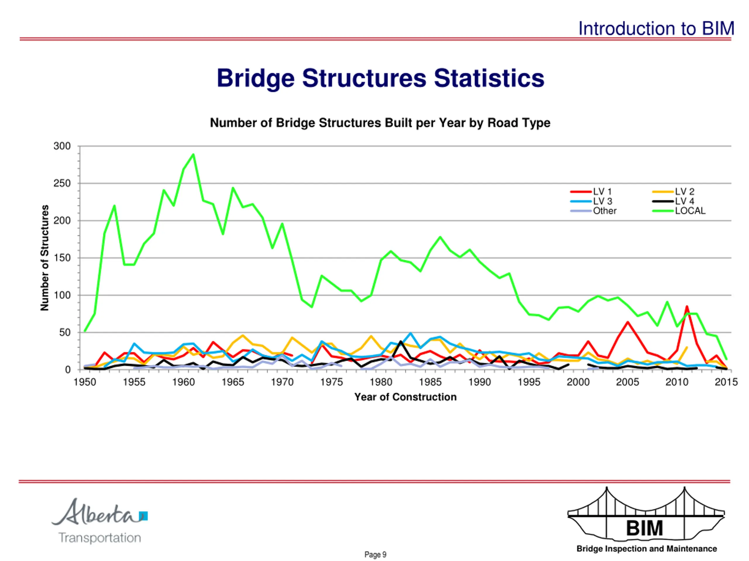 Introduction to BIM Bridge Structures Statistics Number of Bridge Structures Built per Year by Road Type 300 250 LV 1 LV 3 Other LV 2 LV 4 LOCAL Number of Structures 200 150 100 50 0 1950 1955 1960 1965 1970 1975 1980 1985 1990 1995 2000 2005 2010 2015 Year of Construction BIM Bridge Inspection and Maintenance Page 9