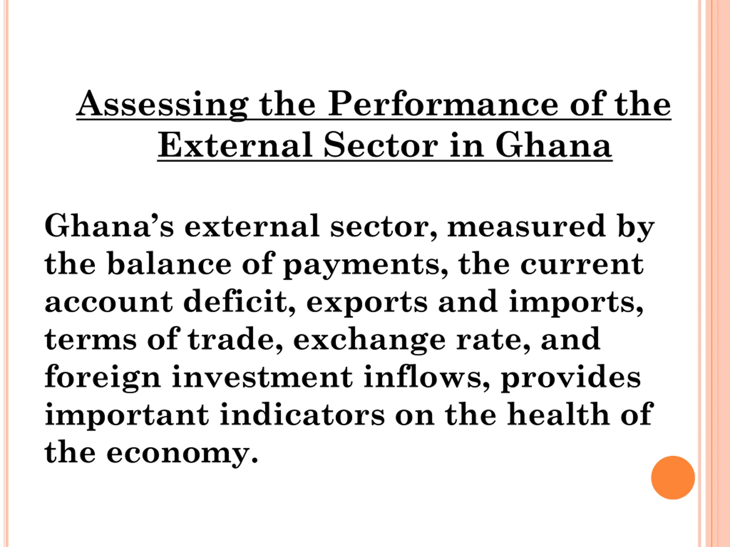 Assessing the Performance of the External Sector in Ghana Ghana s external sector, measured by the balance of payments, the current account deficit, exports and imports, terms of trade, exchange rate, and foreign investment inflows, provides important indicators on the health of the economy.