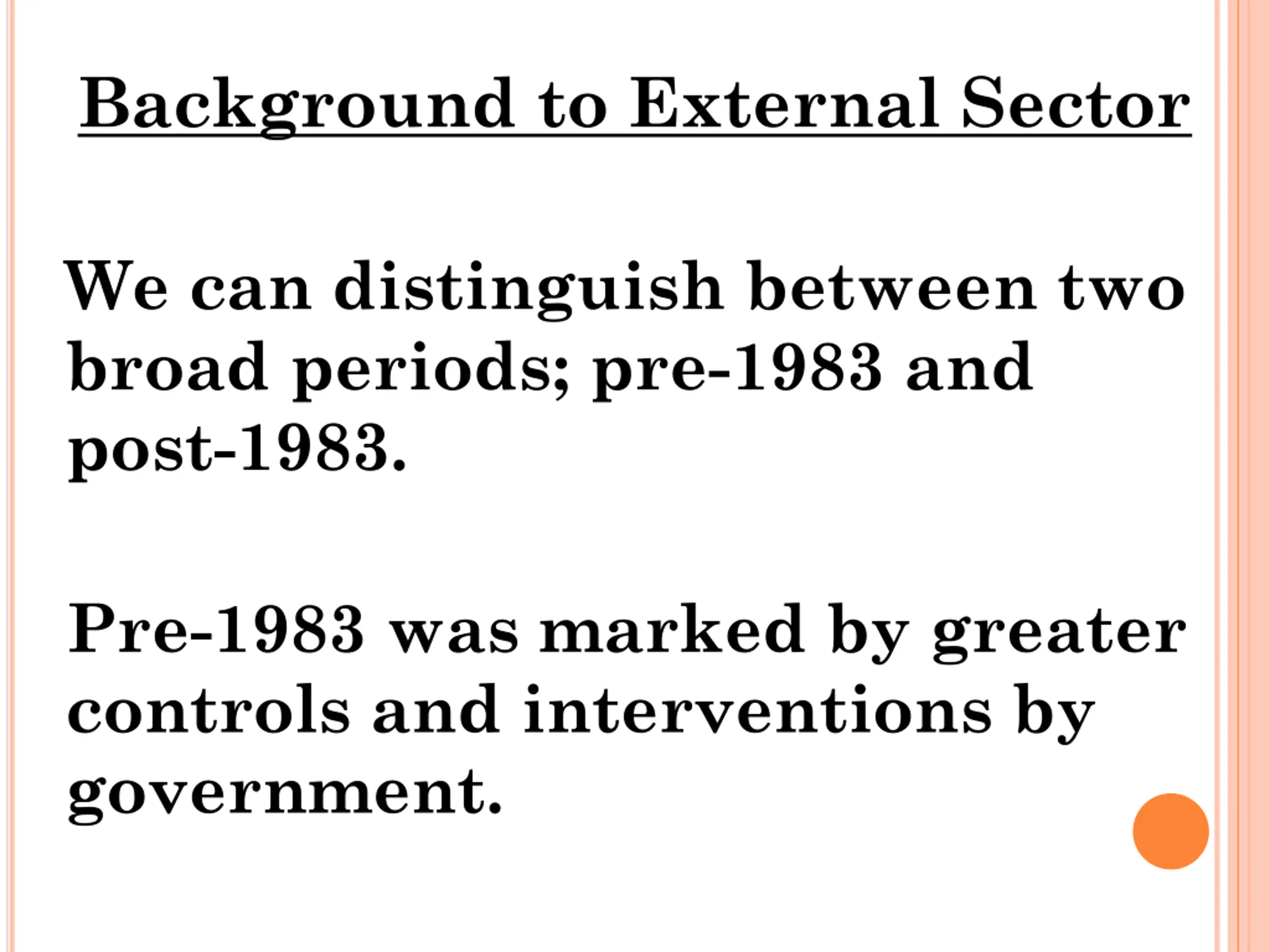 Background to External Sector We can distinguish between two broad periods; pre-1983 and post-1983. Pre-1983 was marked by greater controls and interventions by government.
