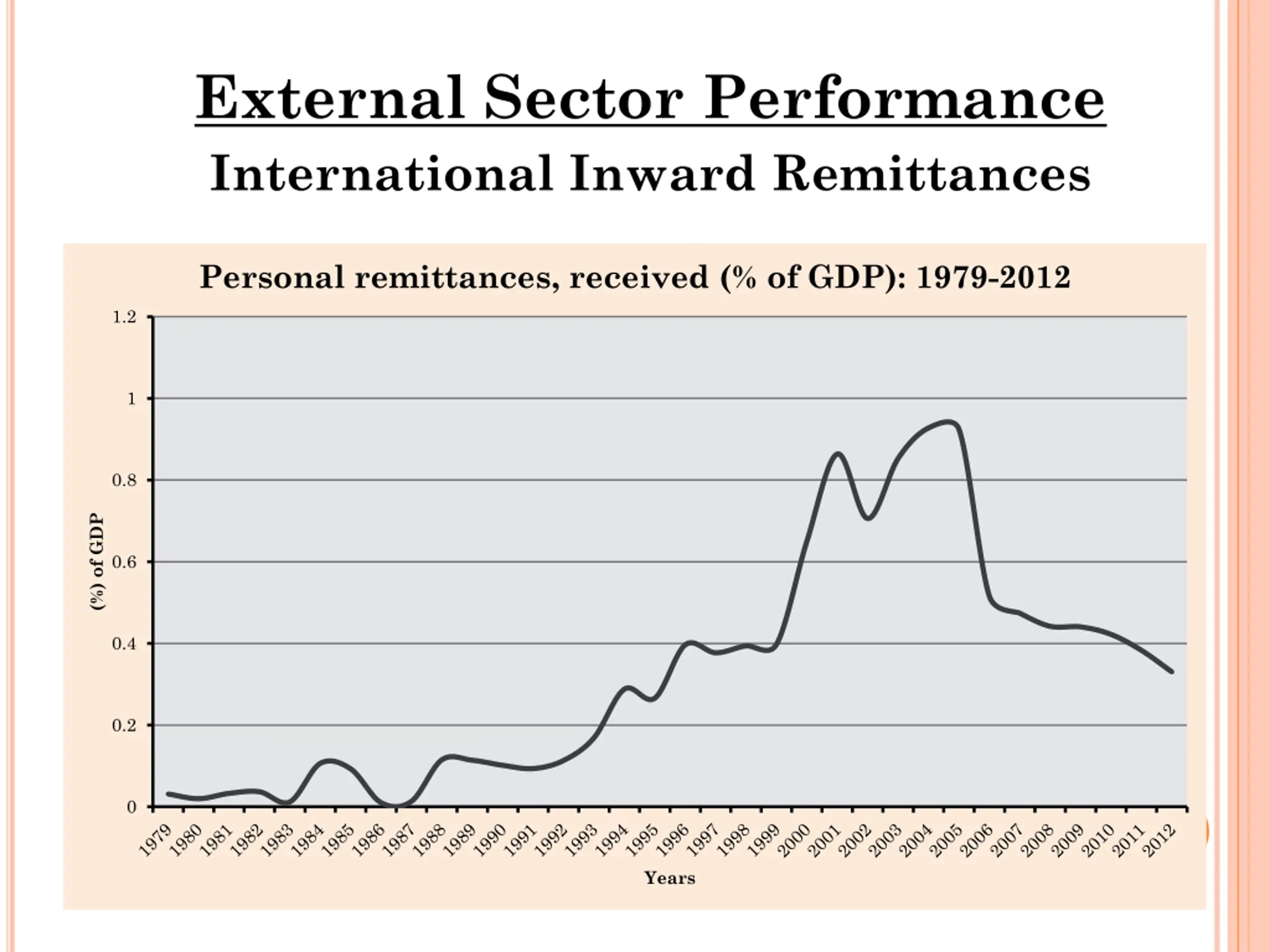 External Sector Performance International Inward Remittances Personal remittances, received (% of GDP): 1979-2012 1.2 1 0.8 (%) of GDP 0.6 0.4 0.2 0 Years