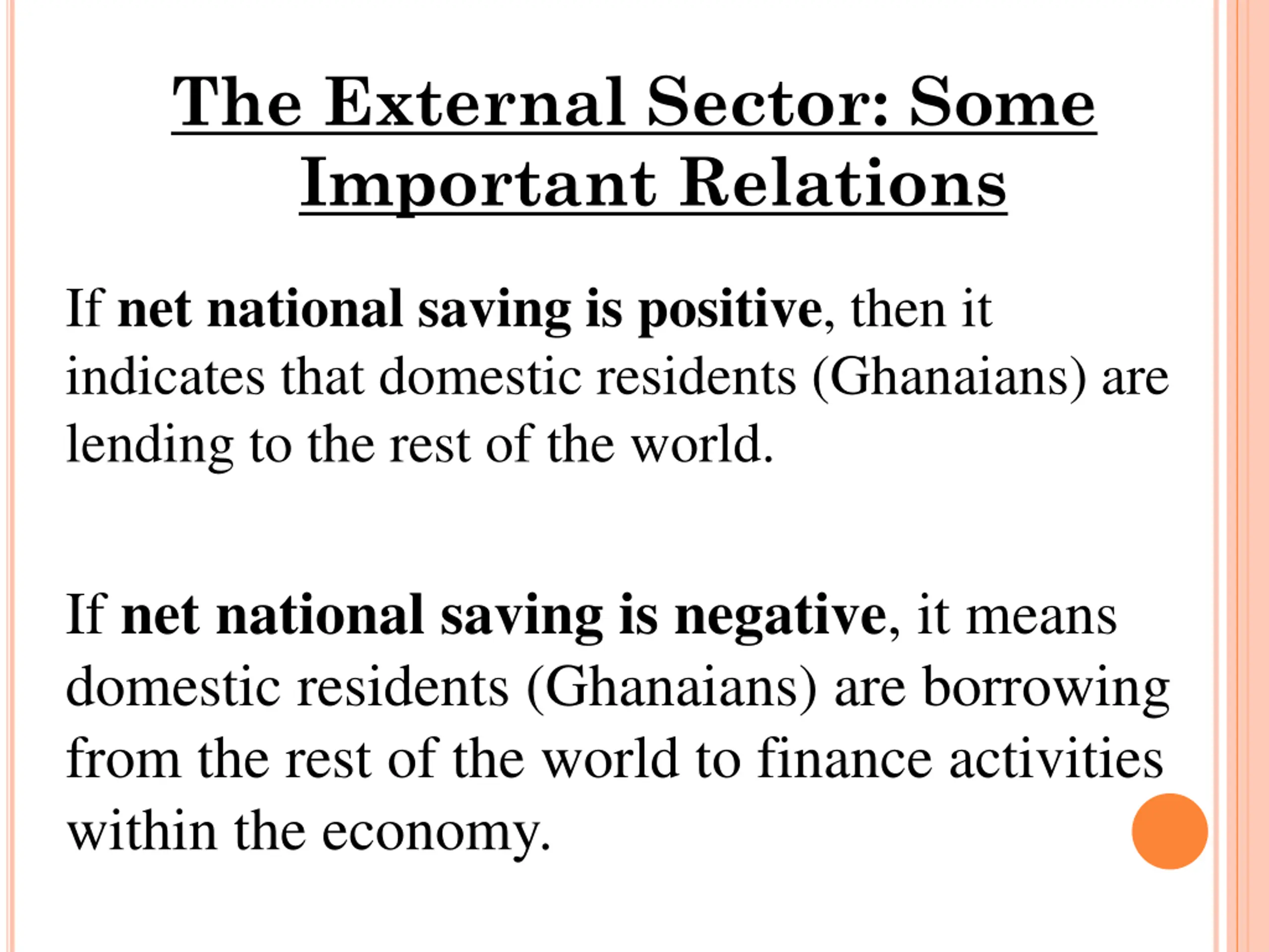 The External Sector: Some Important Relations If net national saving is positive, then it indicates that domestic residents (Ghanaians) are lending to the rest of the world. If net national saving is negative, it means domestic residents (Ghanaians) are borrowing from the rest of the world to finance activities within the economy.