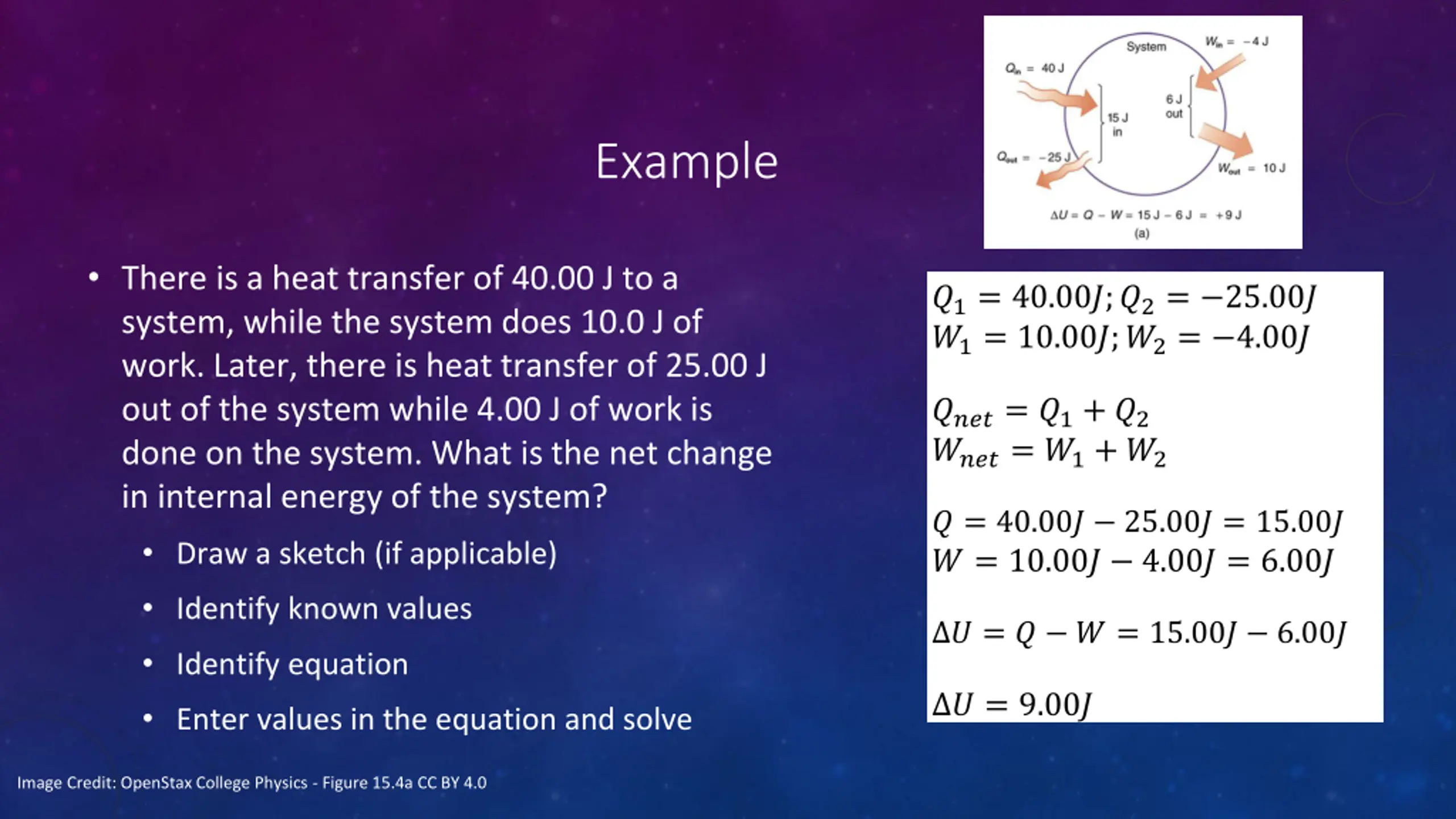 Example There is a heat transfer of 40.00 J to a system, while the system does 10.0 J of work. Later, there is heat transfer of 25.00 J out of the system while 4.00 J of work is done on the system. What is the net change in internal energy of the system? Draw a sketch (if applicable) Identify known values Identify equation Enter values in the equation and solve Image Credit: OpenStax College Physics - Figure 15.4a CC BY 4.0