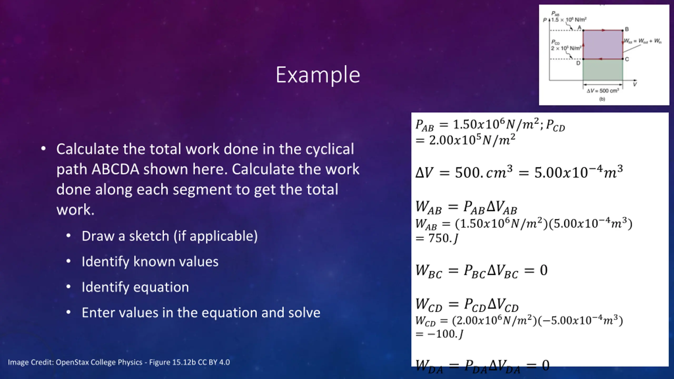 Example Calculate the total work done in the cyclical path ABCDA shown here. Calculate the work done along each segment to get the total work. Draw a sketch (if applicable) Identify known values Identify equation Enter values in the equation and solve Image Credit: OpenStax College Physics - Figure 15.12b CC BY 4.0