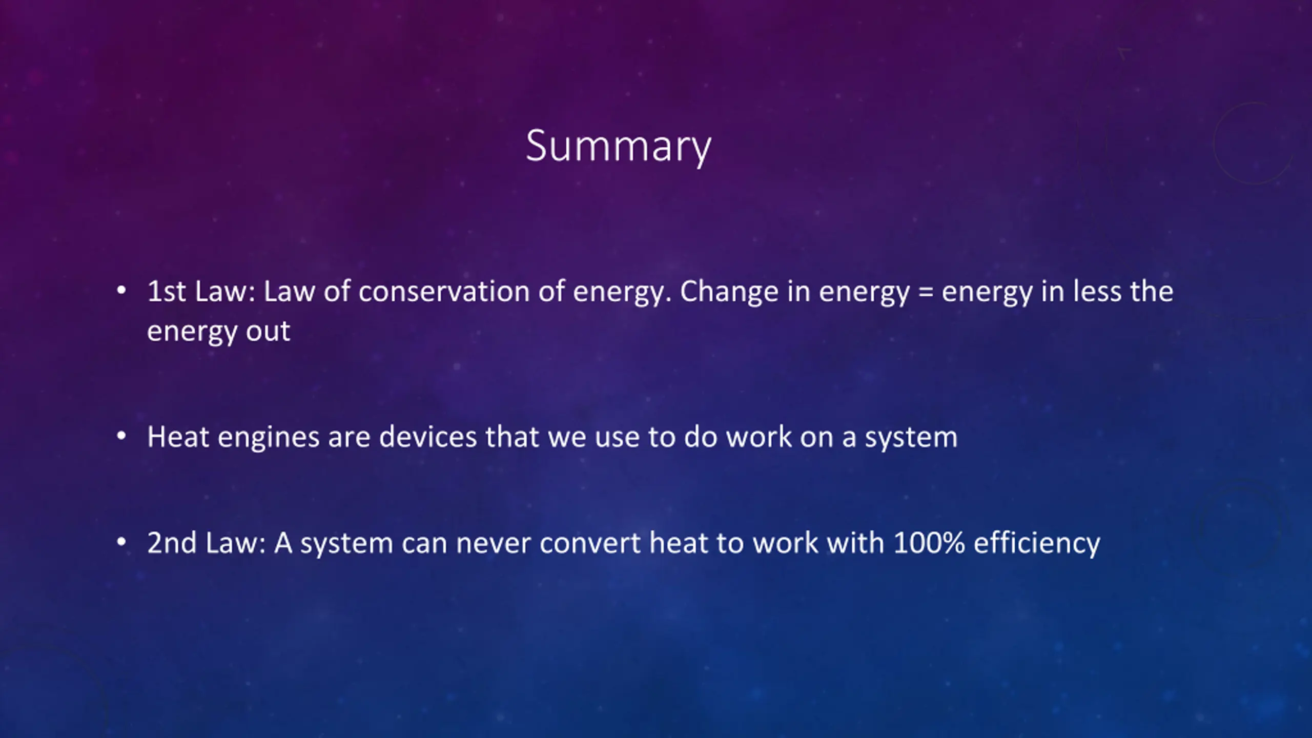 Summary 1st Law: Law of conservation of energy. Change in energy = energy in less the energy out Heat engines are devices that we use to do work on a system 2nd Law: A system can never convert heat to work with 100% efficiency