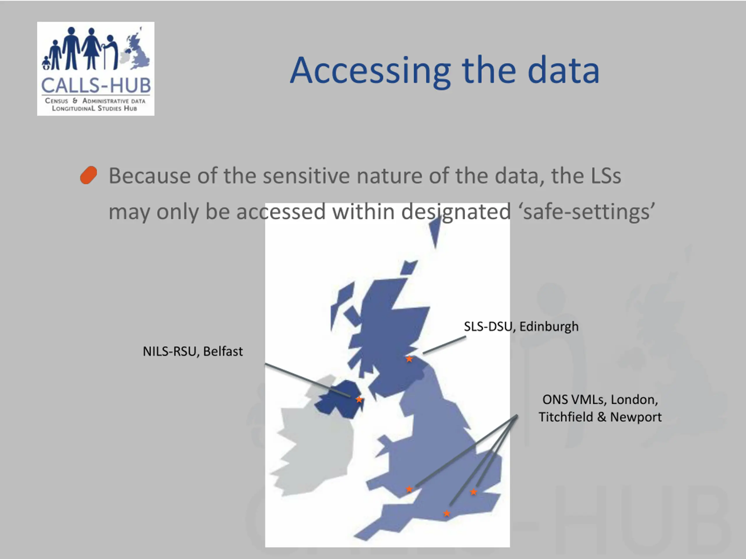 Accessing the data Because of the sensitive nature of the data, the LSs may only be accessed within designated safe-settings SLS-DSU, Edinburgh NILS-RSU, Belfast ONS VMLs, London, Titchfield & Newport
