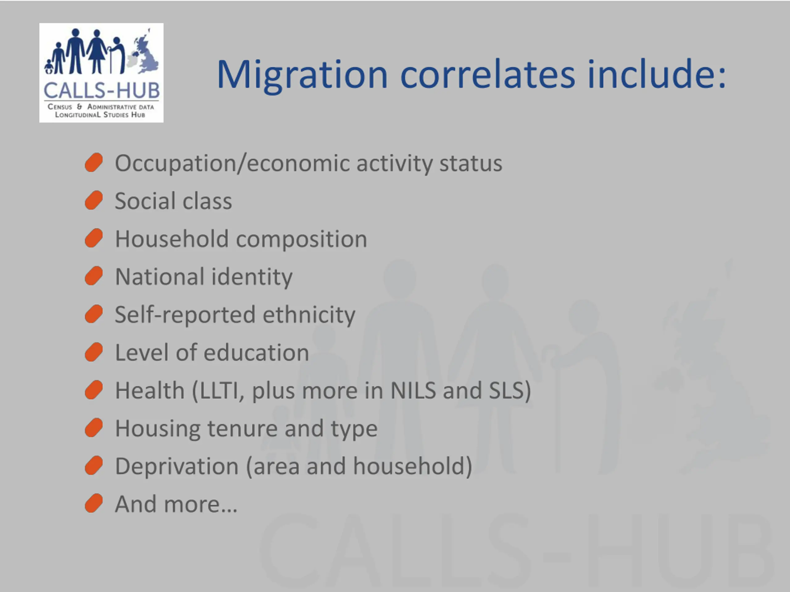 Migration correlates include: Occupation/economic activity status Social class Household composition National identity Self-reported ethnicity Level of education Health (LLTI, plus more in NILS and SLS) Housing tenure and type Deprivation (area and household) And more