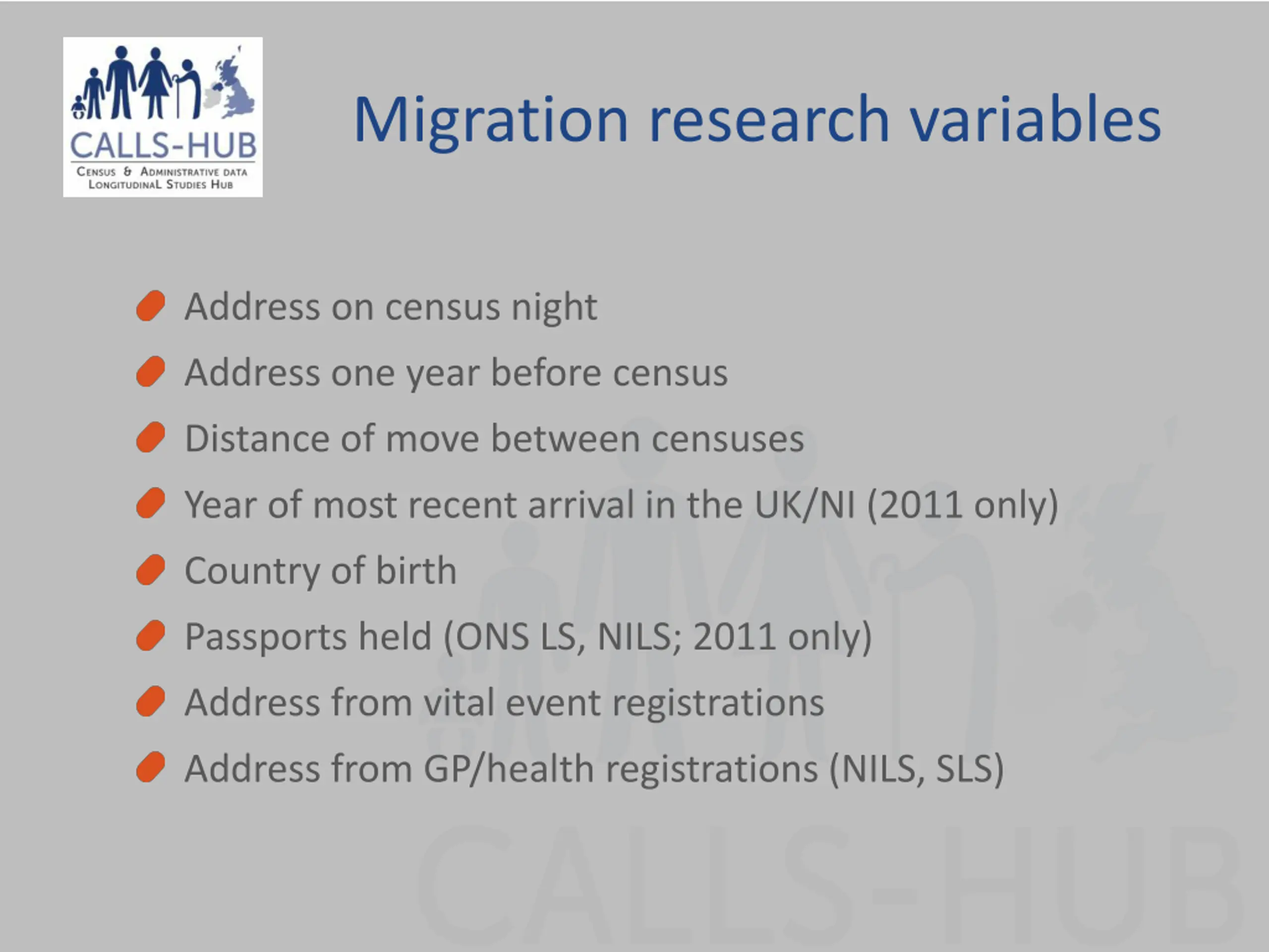 Migration research variables Address on census night Address one year before census Distance of move between censuses Year of most recent arrival in the UK/NI (2011 only) Country of birth Passports held (ONS LS, NILS; 2011 only) Address from vital event registrations Address from GP/health registrations (NILS, SLS)