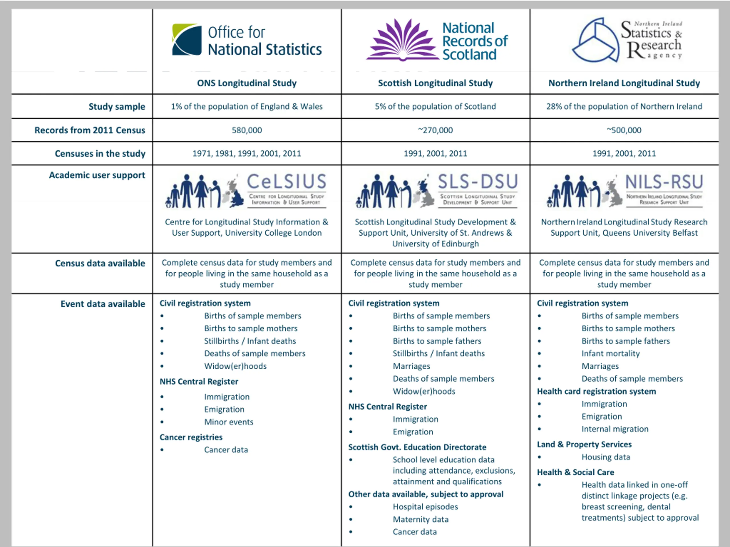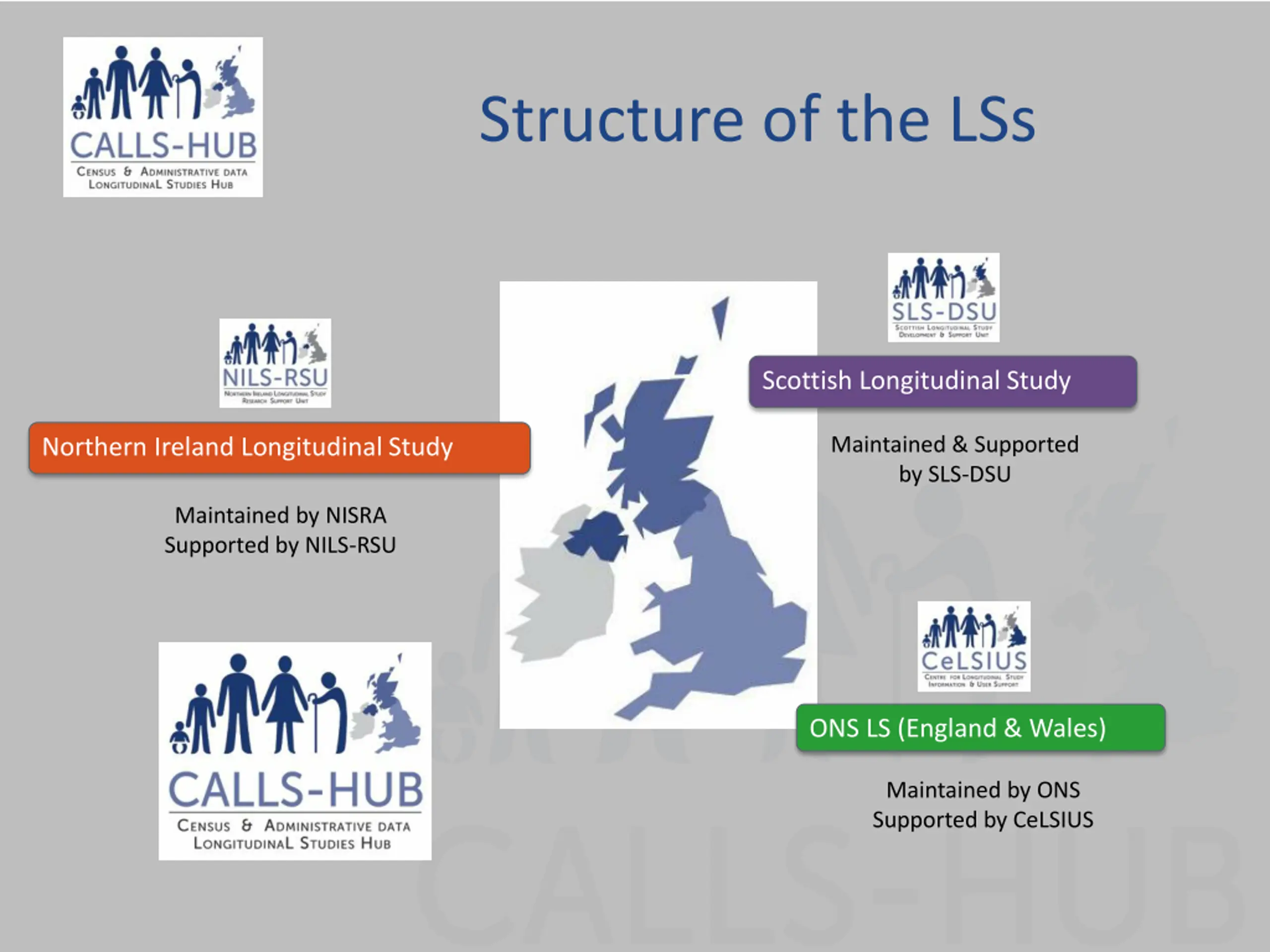 Structure of the LSs Scottish Longitudinal Study Maintained & Supported by SLS-DSU Northern Ireland Longitudinal Study Maintained by NISRA Supported by NILS-RSU ONS LS (England & Wales) Maintained by ONS Supported by CeLSIUS