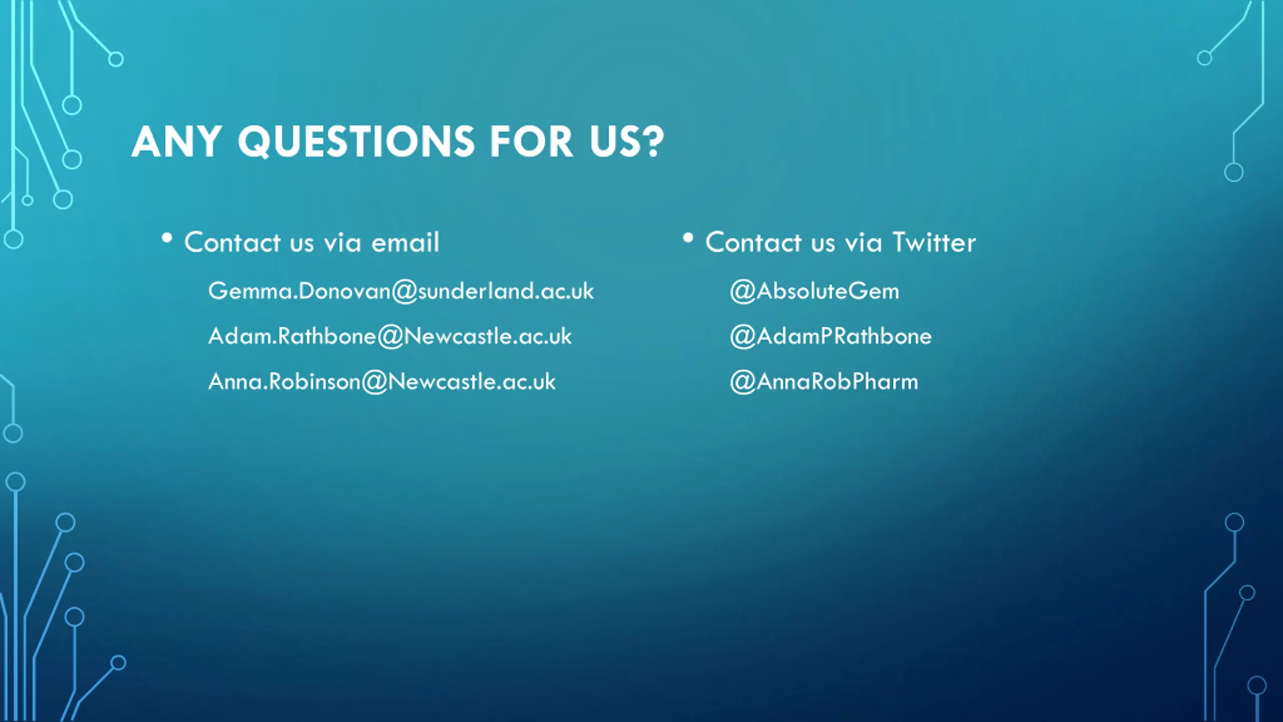 ANY QUESTIONS FOR US? Contact us via email Contact us via Twitter Gemma.Donovan@sunderland.ac.uk @AbsoluteGem Adam.Rathbone@Newcastle.ac.uk @AdamPRathbone Anna.Robinson@Newcastle.ac.uk @AnnaRobPharm