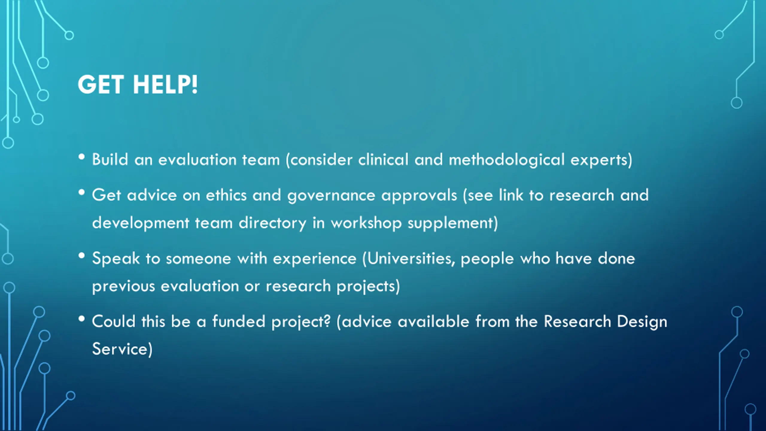 GET HELP! Build an evaluation team (consider clinical and methodological experts) Get advice on ethics and governance approvals (see link to research and development team directory in workshop supplement) Speak to someone with experience (Universities, people who have done previous evaluation or research projects) Could this be a funded project? (advice available from the Research Design Service)
