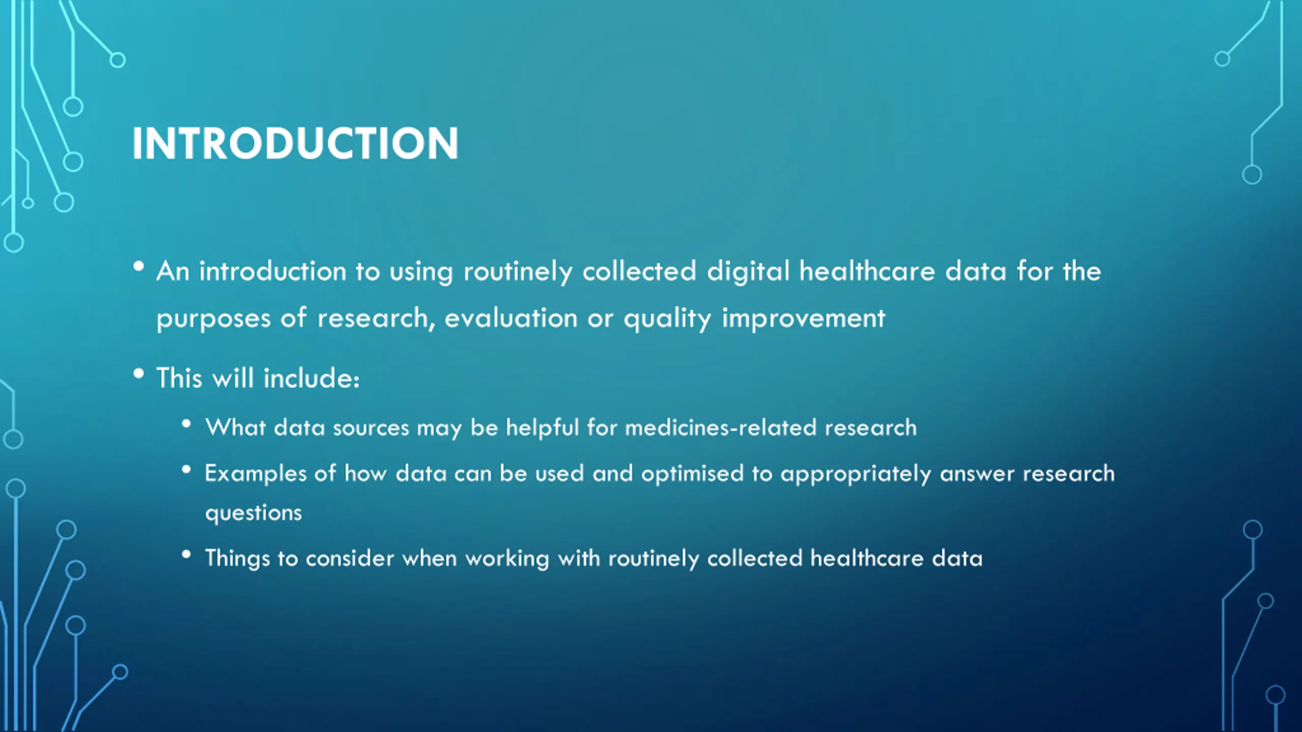 INTRODUCTION An introduction to using routinely collected digital healthcare data for the purposes of research, evaluation or quality improvement This will include: What data sources may be helpful for medicines-related research Examples of how data can be used and optimised to appropriately answer research questions Things to consider when working with routinely collected healthcare data