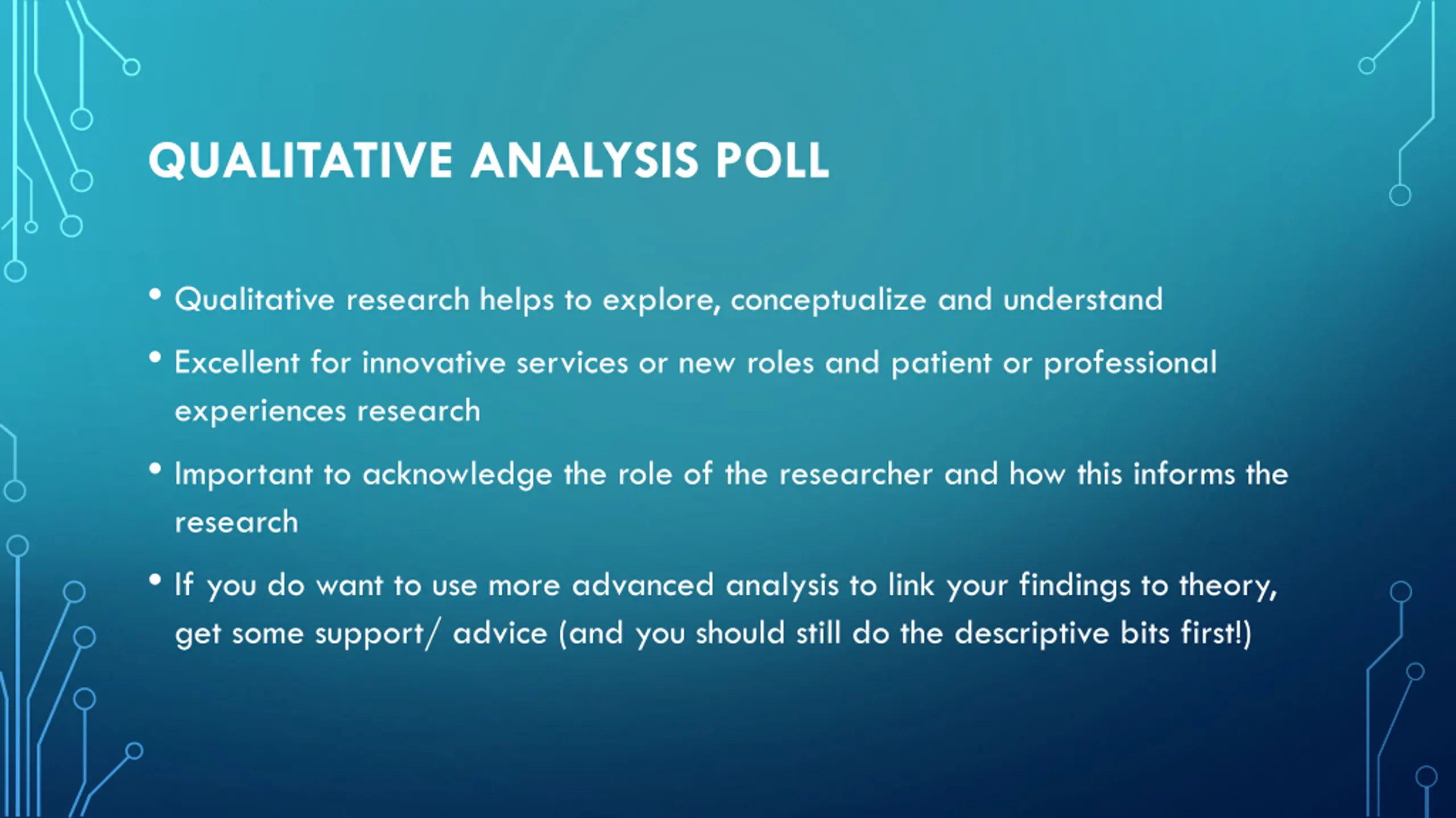QUALITATIVE ANALYSIS POLL Qualitative research helps to explore, conceptualize and understand Excellent for innovative services or new roles and patient or professional experiences research Important to acknowledge the role of the researcher and how this informs the research If you do want to use more advanced analysis to link your findings to theory, get some support/ advice (and you should still do the descriptive bits first!)