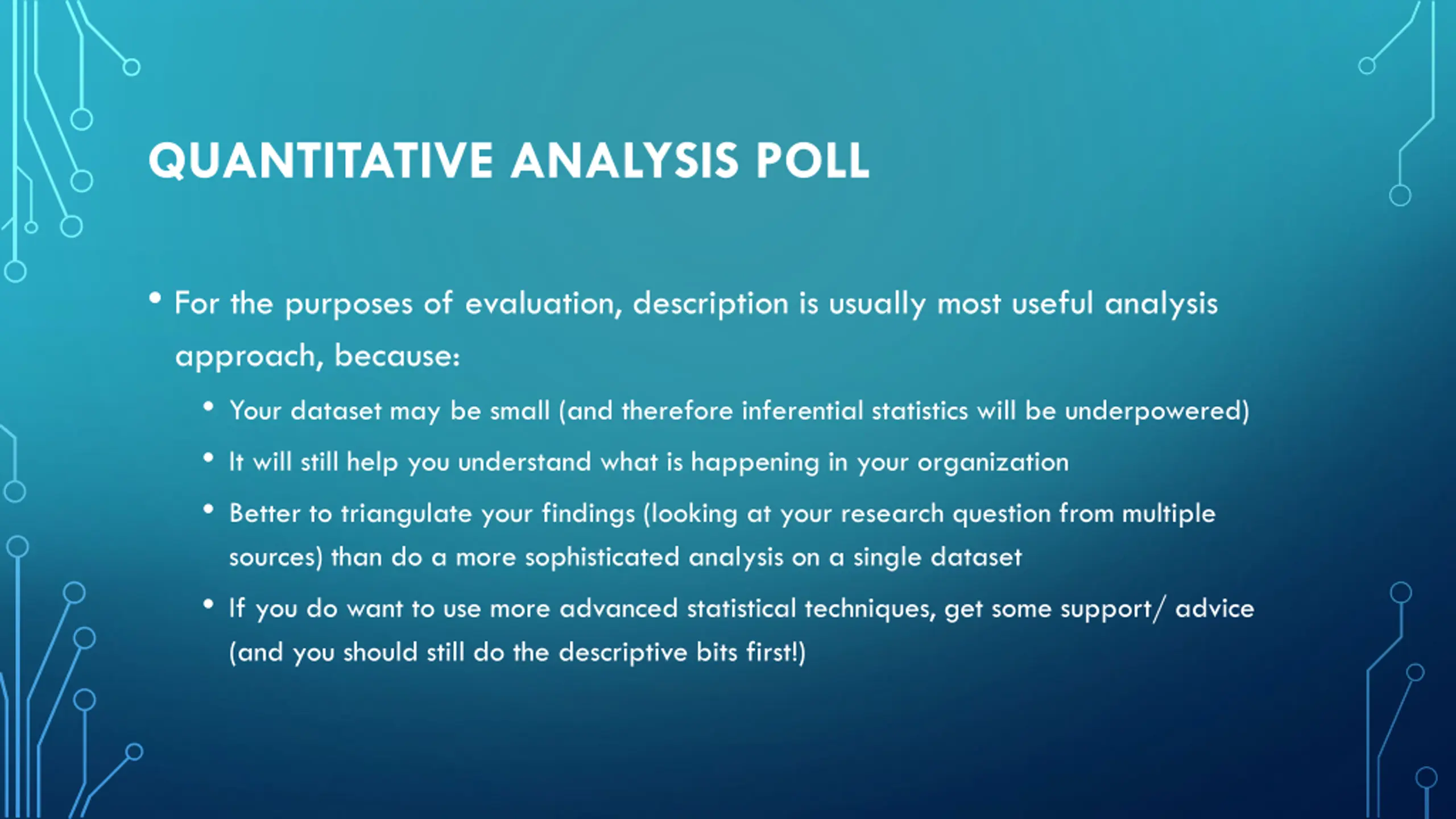 QUANTITATIVE ANALYSIS POLL For the purposes of evaluation, description is usually most useful analysis approach, because: Your dataset may be small (and therefore inferential statistics will be underpowered) It will still help you understand what is happening in your organization Better to triangulate your findings (looking at your research question from multiple sources) than do a more sophisticated analysis on a single dataset If you do want to use more advanced statistical techniques, get some support/ advice (and you should still do the descriptive bits first!)
