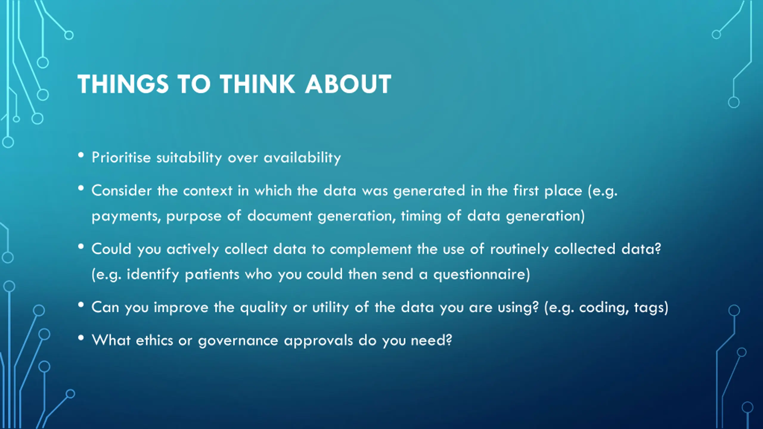 THINGS TO THINK ABOUT Prioritise suitability over availability Consider the context in which the data was generated in the first place (e.g. payments, purpose of document generation, timing of data generation) Could you actively collect data to complement the use of routinely collected data? (e.g. identify patients who you could then send a questionnaire) Can you improve the quality or utility of the data you are using? (e.g. coding, tags) What ethics or governance approvals do you need?