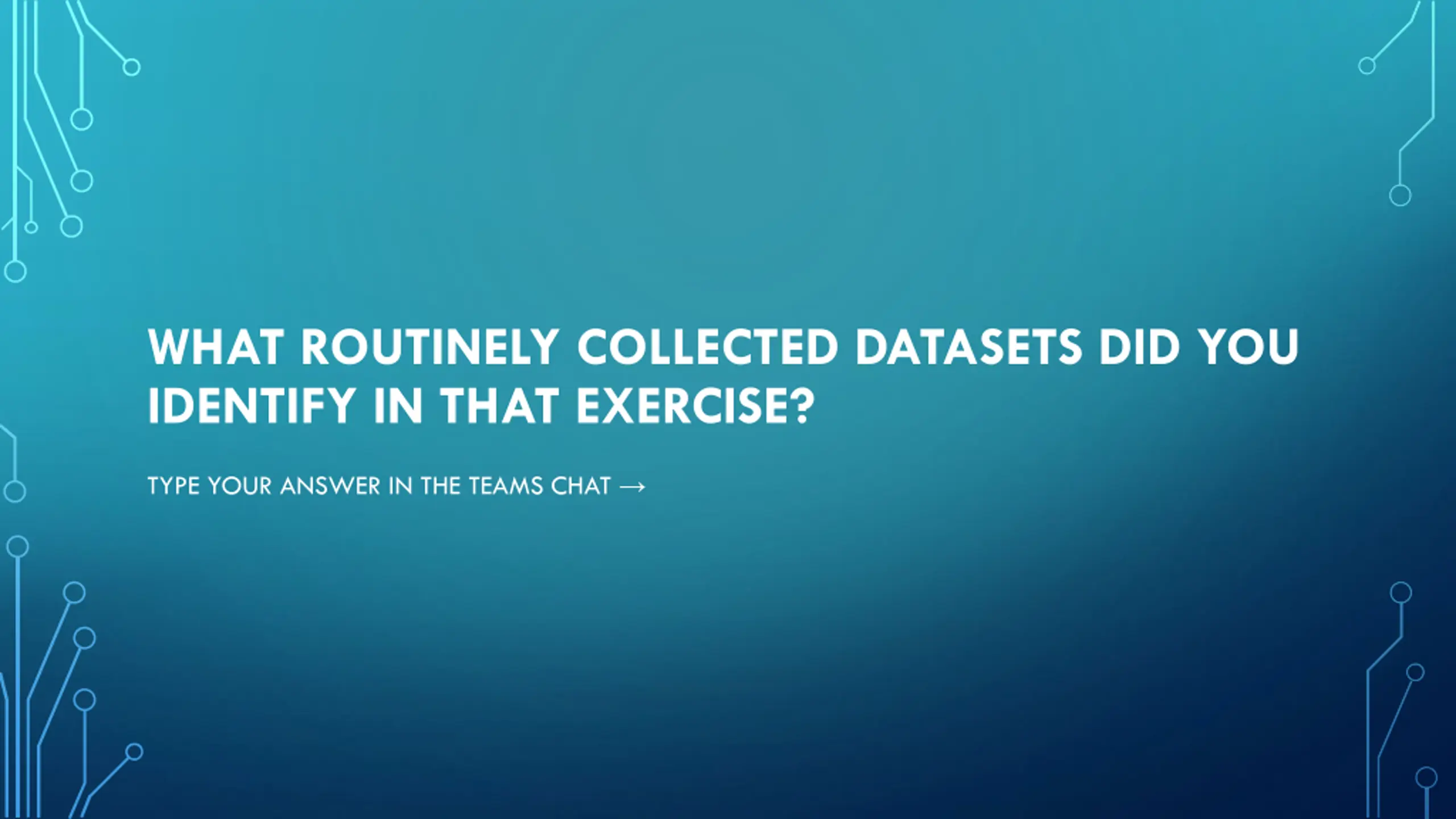 WHAT ROUTINELY COLLECTED DATASETS DID YOU IDENTIFY IN THAT EXERCISE? TYPE YOUR ANSWER IN THE TEAMS CHAT
