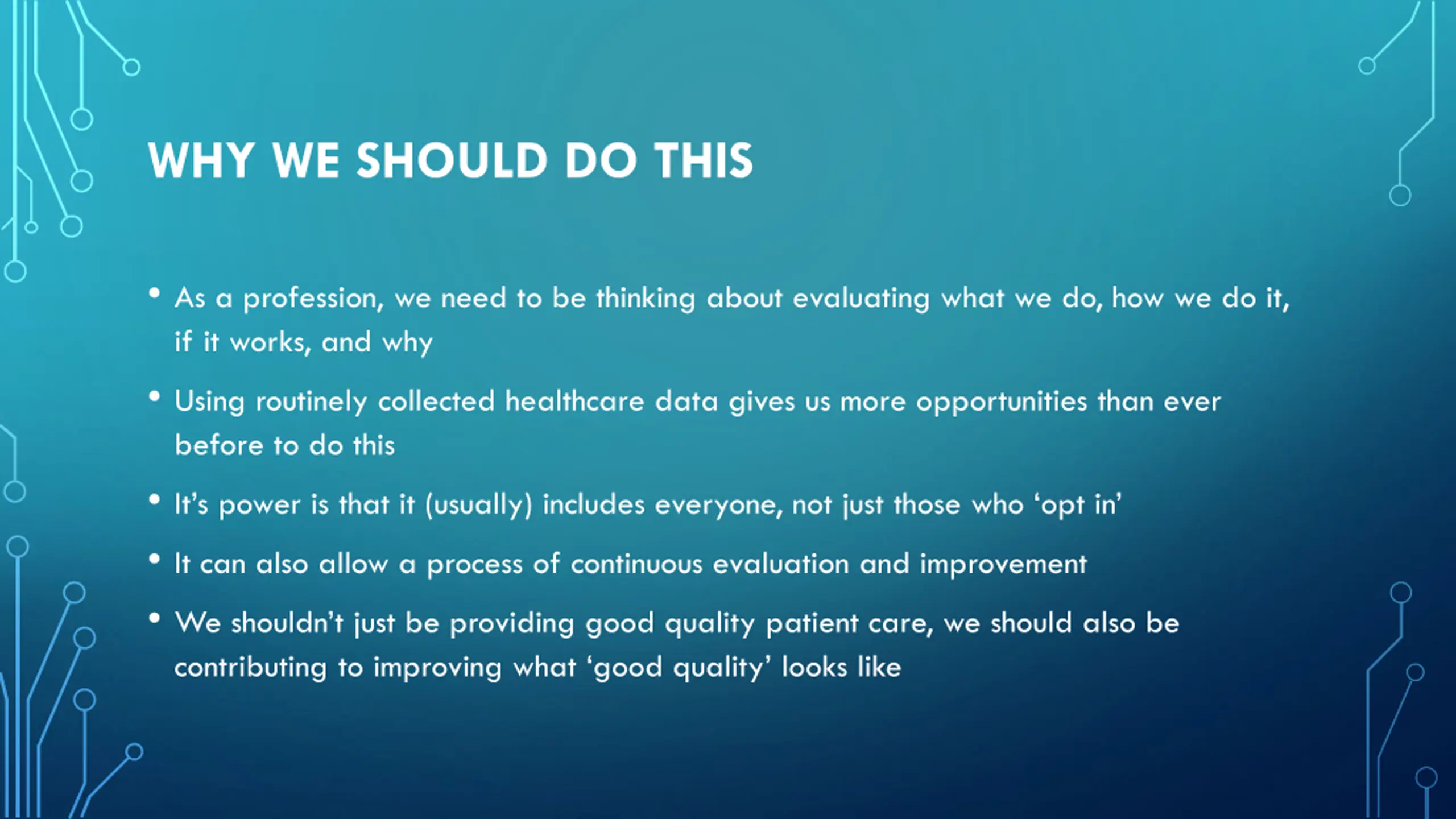 WHY WE SHOULD DO THIS As a profession, we need to be thinking about evaluating what we do, how we do it, if it works, and why Using routinely collected healthcare data gives us more opportunities than ever before to do this It s power is that it (usually) includes everyone, not just those who opt in It can also allow a process of continuous evaluation and improvement We shouldn t just be providing good quality patient care, we should also be contributing to improving what good quality looks like