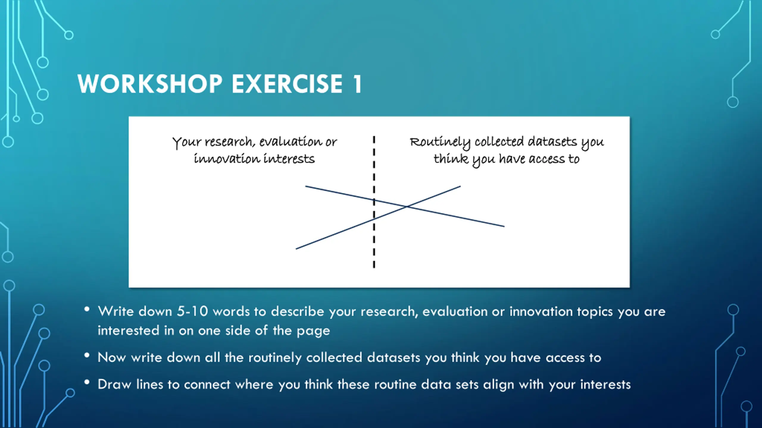 WORKSHOP EXERCISE 1 Your research, evaluation or Your research, evaluation or innovation interests innovation interests Routinely collected datasets you Routinely collected datasets you think you have access to think you have access to Write down 5-10 words to describe your research, evaluation or innovation topics you are interested in on one side of the page Now write down all the routinely collected datasets you think you have access to Draw lines to connect where you think these routine data sets align with your interests